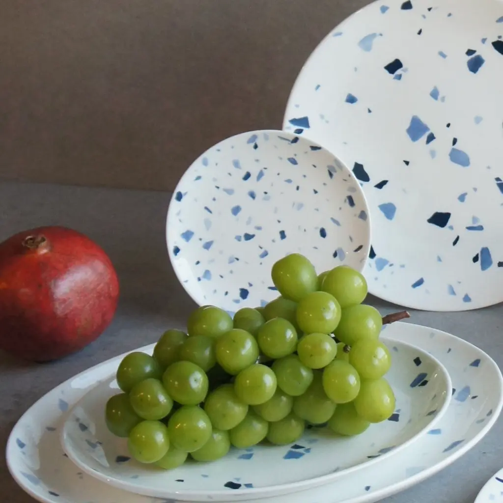 Terrazzo tiles are well known for mixing chips of marble, granite and other stones into the base material for tiles to create visual appeal in otherwise plain surfaces. This style was particularly popular during the art-deco period of architecture. Using the traditional blue-and-white colour combination of Bone Chinaware and the inspiration from this type of surface treatment, Twig New York presents the Terrazzo Azzurro collection. Ideal for Bread, Tidbits and DessertsTwo plates per boxFine Bone China with hand applied decalDishwasher & Microwave safeTerrazzo Azzurro Collection