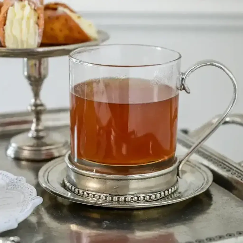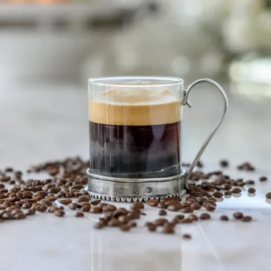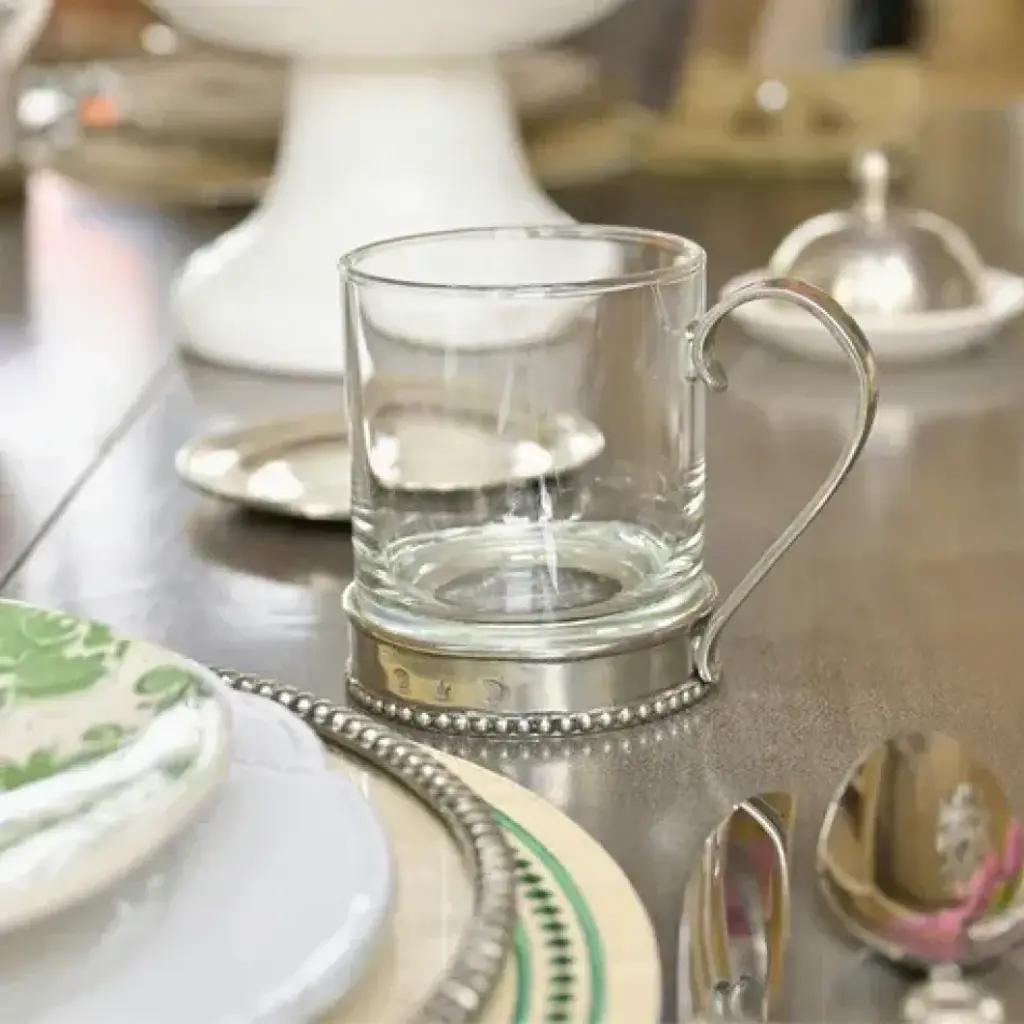 Glass and pewter pair beautifully once again in this new Tesoro Glass Mug. Elevate your morning routine. The delicate pewter base provides a striking contrast to the beaded rim, making it a work of art on your table. Savor your coffee or tea in style and sophistication with this elegant addition to your collection. Founded in 1997 by Ann Skidmore, Arte Italica is a story of one woman's passion for Italian history, culture, art, and vintage pewter. Today, Arte Italica is one of the leading importers of European tabletop and home accessories products in the United States. Every piece is handmade and designed so that they can easily be mixed and matched to create a timeless, classic, and effortless look.