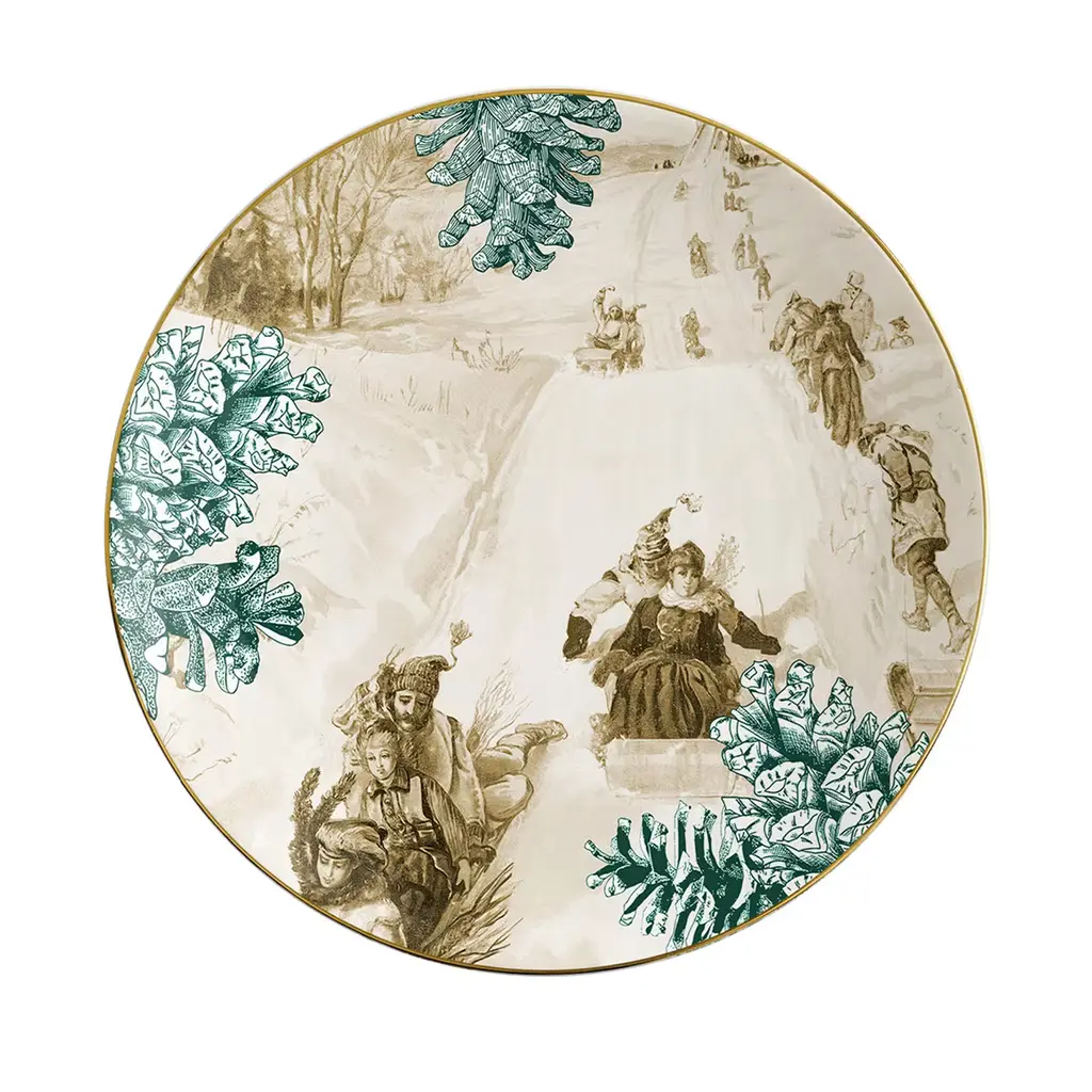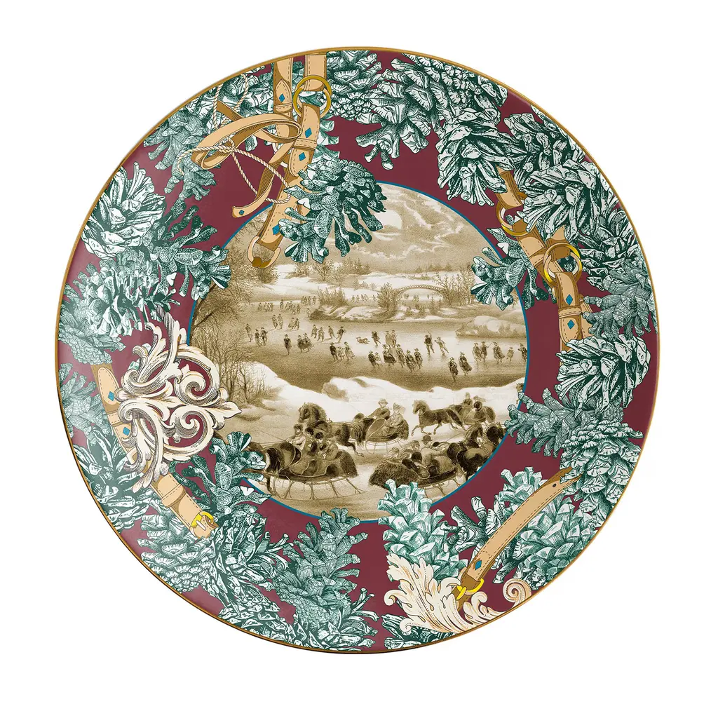 The Big White collection is dedicated to Christmas and its magic. The design of the six main dishes is made up of an intertwining of pine cones and fences with gold details that surround six different winter scenes including snowy landscapes, ice skaters on frozen lakes and young people playing with sleds. The typical colors of Christmas are gathered here and used to tell the tradition and romantic imagery that it brings with it in an elegant and impactful way.