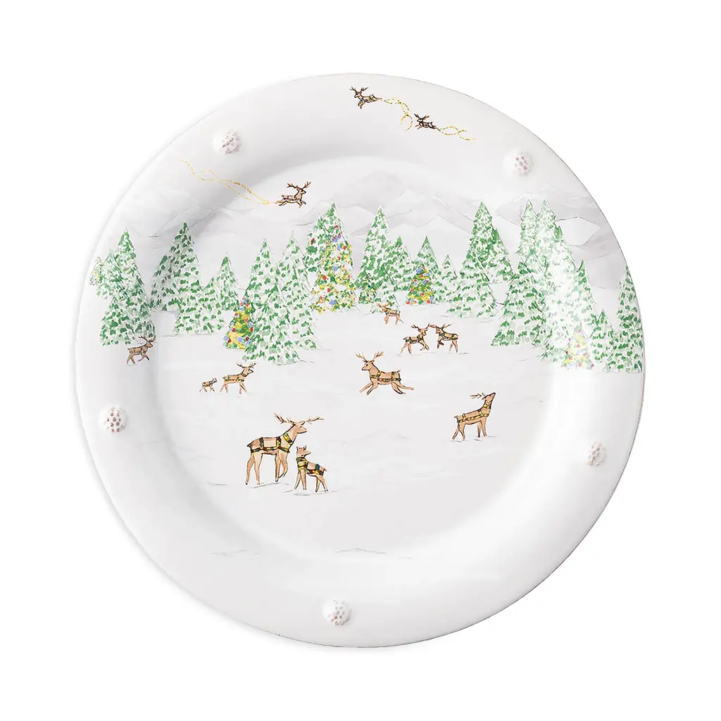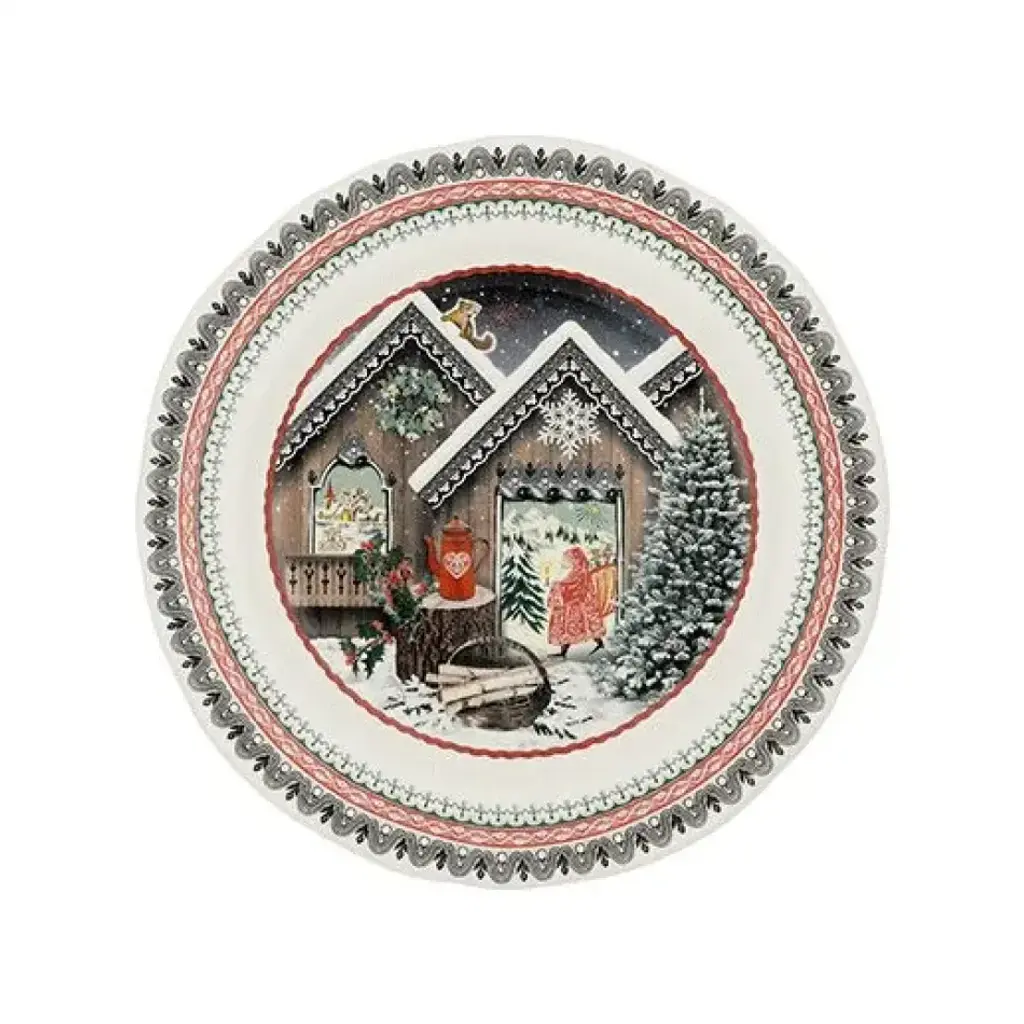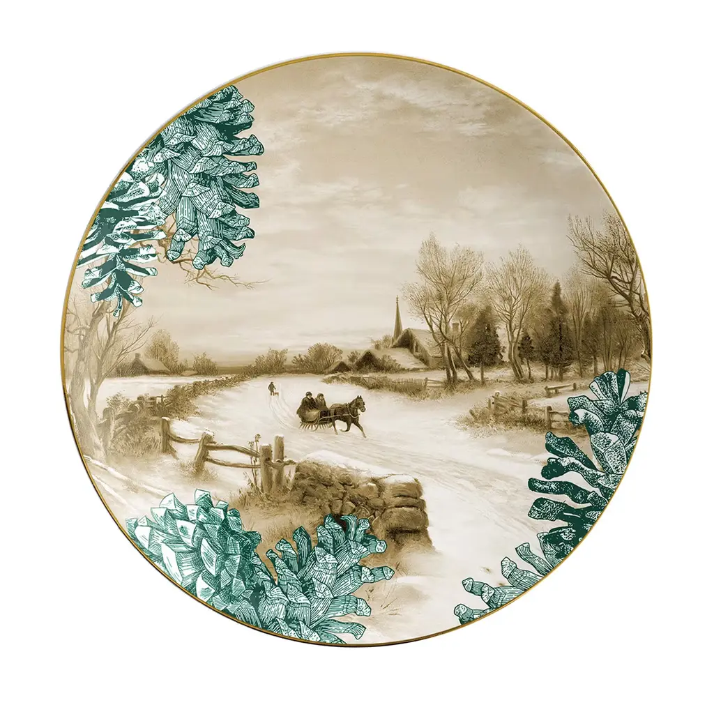 The Big White collection is dedicated to Christmas and its magic. The design of the six main dishes is made up of an intertwining of pine cones and fences with gold details that surround six different winter scenes including snowy landscapes, ice skaters on frozen lakes and young people playing with sleds. The typical colors of Christmas are gathered here and used to tell the tradition and romantic imagery that it brings with it in an elegant and impactful way.