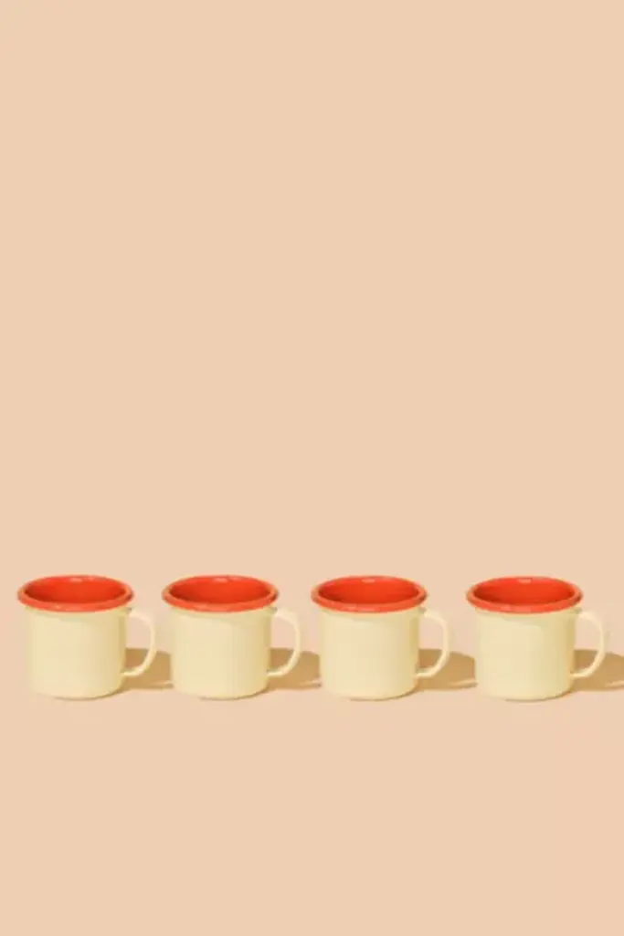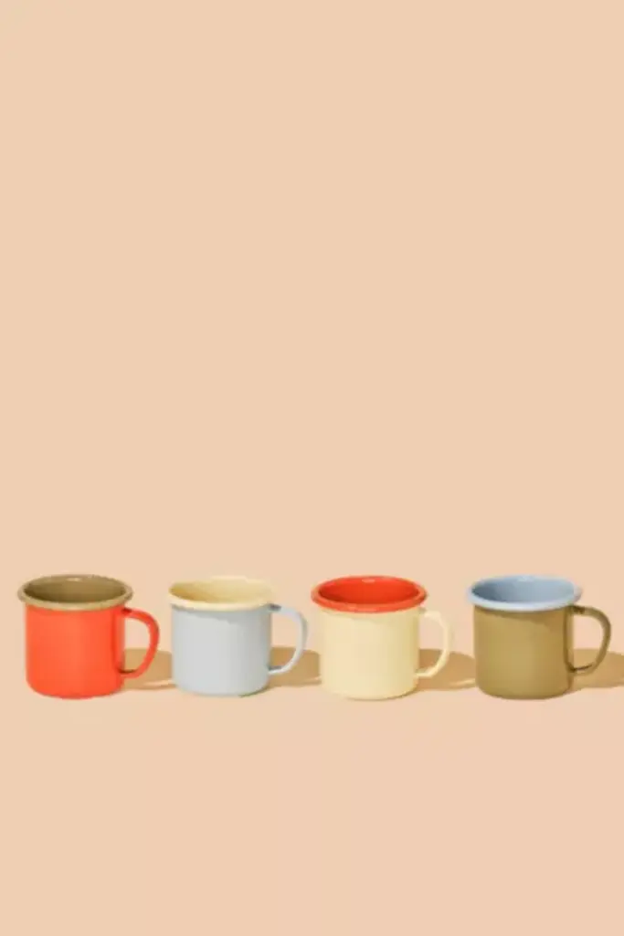 Lightweight, stackable and meant to last a lifetime, this collection of enamelware is inspired by vintage camping adventures. With Sky, Brick, Cream and Olive designed to stand alone or play well together, this is our version of your childhood camping set. Each set includes 4 x mugs **Content + Care** \- Made from enamel-coated food-grade steel. \- If you drop our enamelware, it might chip, but it won't break. If the powder coating chips, the steel beneath it may naturally oxidize. The enamelware remains safe to use. \- Recommended hand wash. \- Do not use abrasive cleaners or hard water stain removers. \- Imported **Dimensions** Mug: 3.25" tall, 3.75" diameter