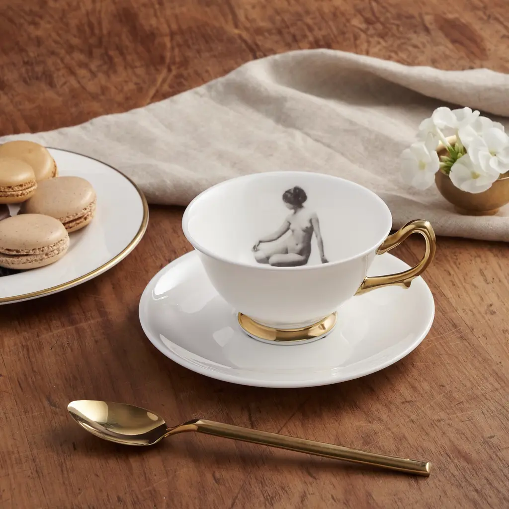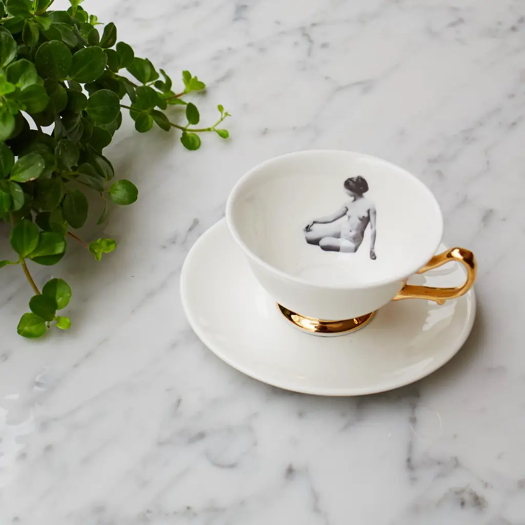 An exquisitely handcrafted fine bone china teacup and saucer with The Girl design from the Melody Rose Modern Surrealist collection.Handmade in Stoke-on-Trent, England's pottery heartland, each teacup features hand painted 22kt burnished gold for a luxurious and dishwasher friendly finish.The playful design paired with the best of British craftsmanship makes this teacup and saucer the perfect gift for foodies, design lovers and everyone in between.Durable enough for every day use, the 22kt gilding and glorious detail also make them perfect for the grandest occasions.