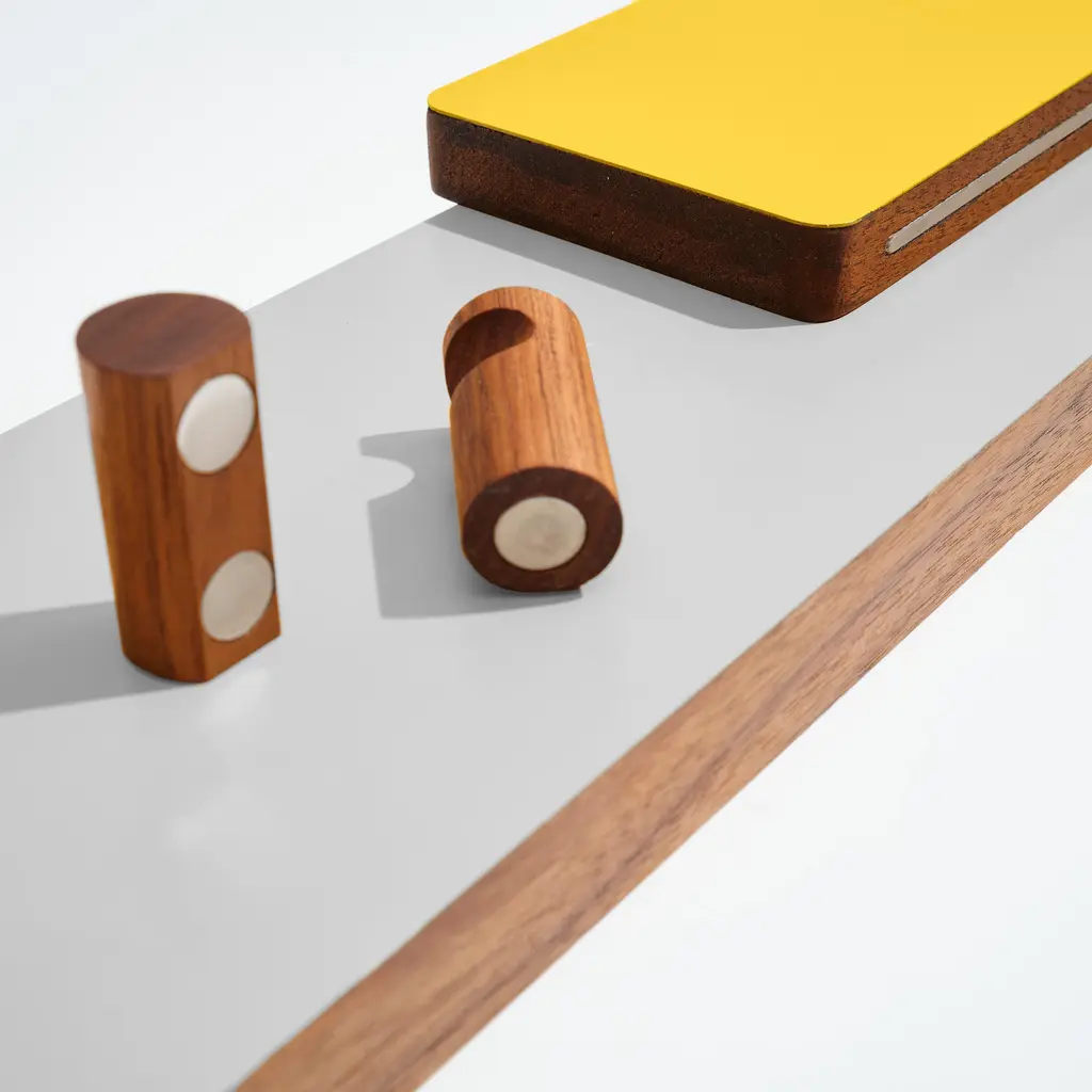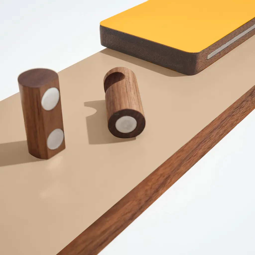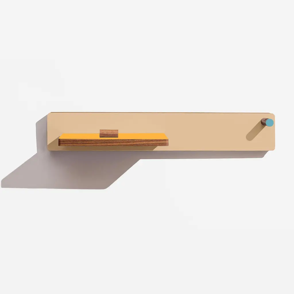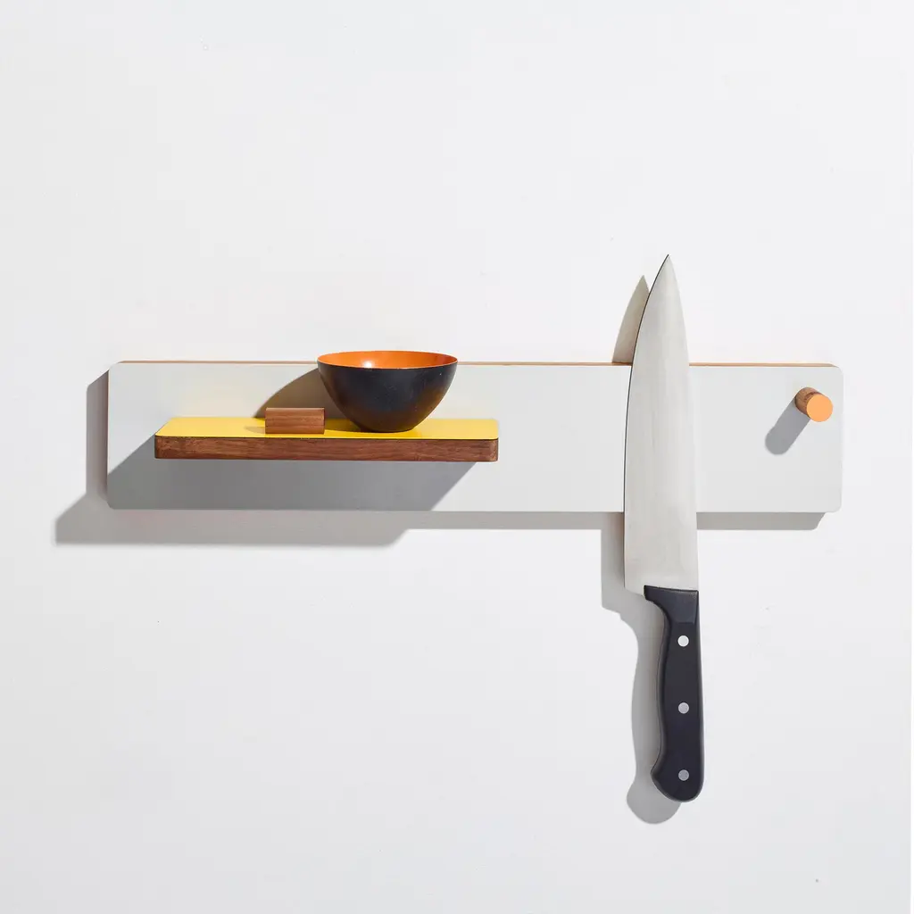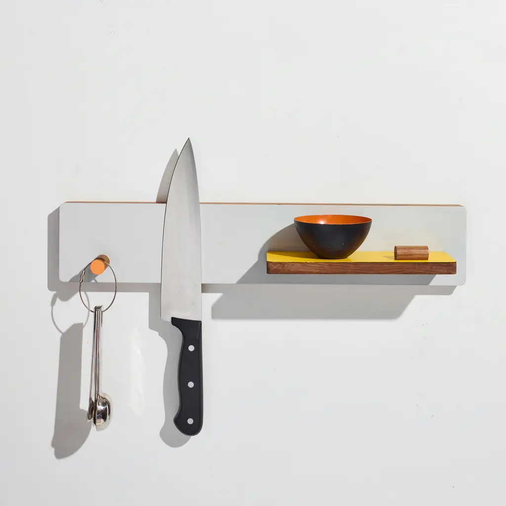 Can one rack keep chef’s knives sharp, stash the salt, and still look clean on the backsplash? Yes — a hidden grid of magnets grips blades along a powder-coated beige face while a slim walnut ledge and single hook handle the rest. Ilan Rubin of ilanilan distills three countertop essentials into one understated wall panel, letting solid American walnut frame the quiet utility of powder-coated steel. The magnets sit just beneath the surface, so blades snap flat and stay protected from edge dings. A 1-inch-deep shelf keeps finishing salt, pepper, or that bottle of chili crisp within arm’s reach, and the brass-tipped hook swings out for a potholder or favorite ladle. Walnut’s warm grain softens the hardware’s matte beige, and a keyhole backplate makes mounting as simple as two screws. Install the Knife Rack above a prep zone, beside the stove, or by an outdoor grill station; it clears counter space, puts every tool in sight, and wipes clean with a damp cloth at the end of service.