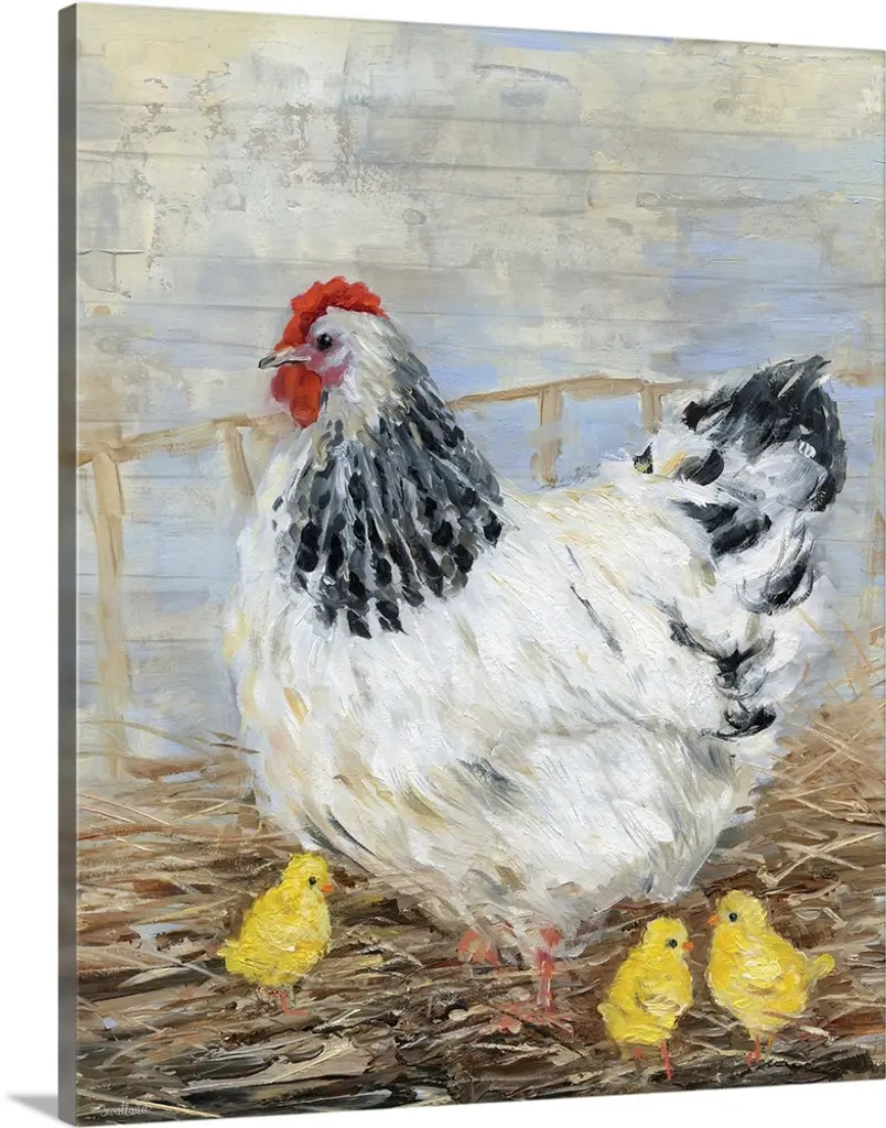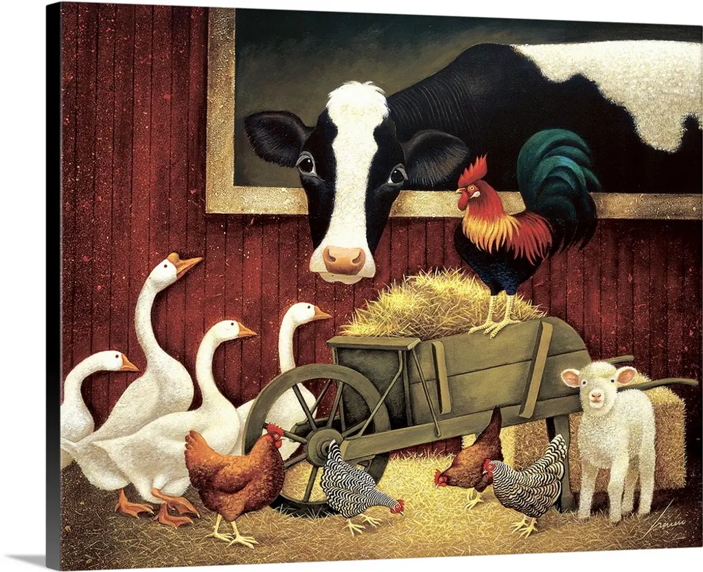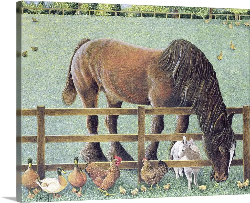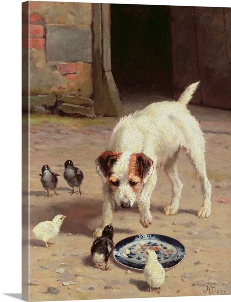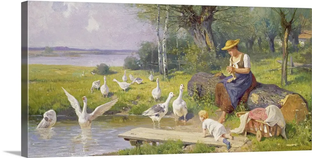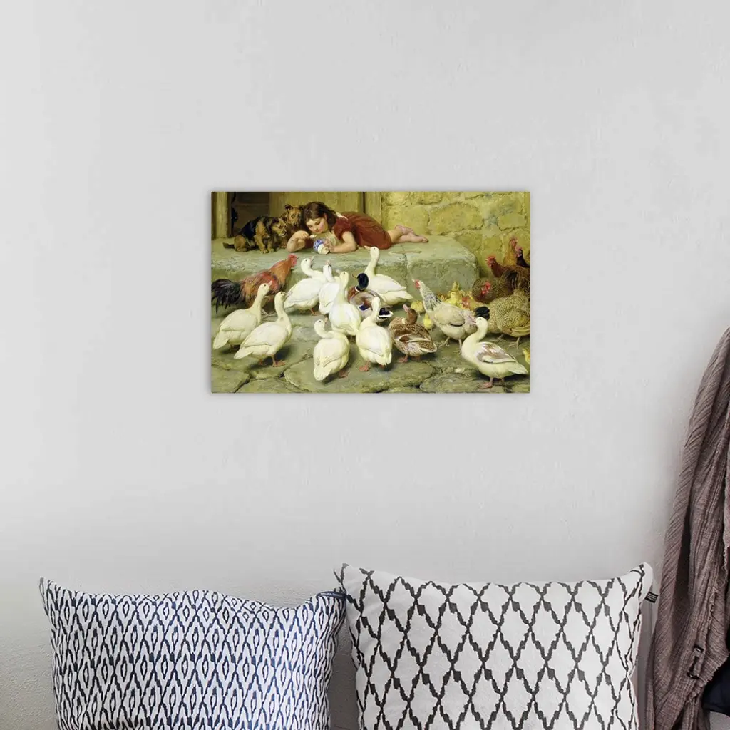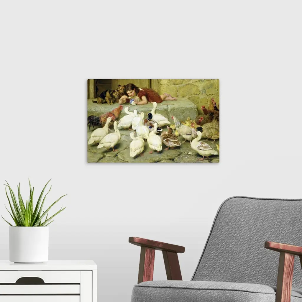 Landscape, classic painting of a small girl lying on a stone step, about to eat a spoonful of food from a bowl she is holding. Next to her are two begging dogs, and a large flock of ducks and chickens surround her below the step.