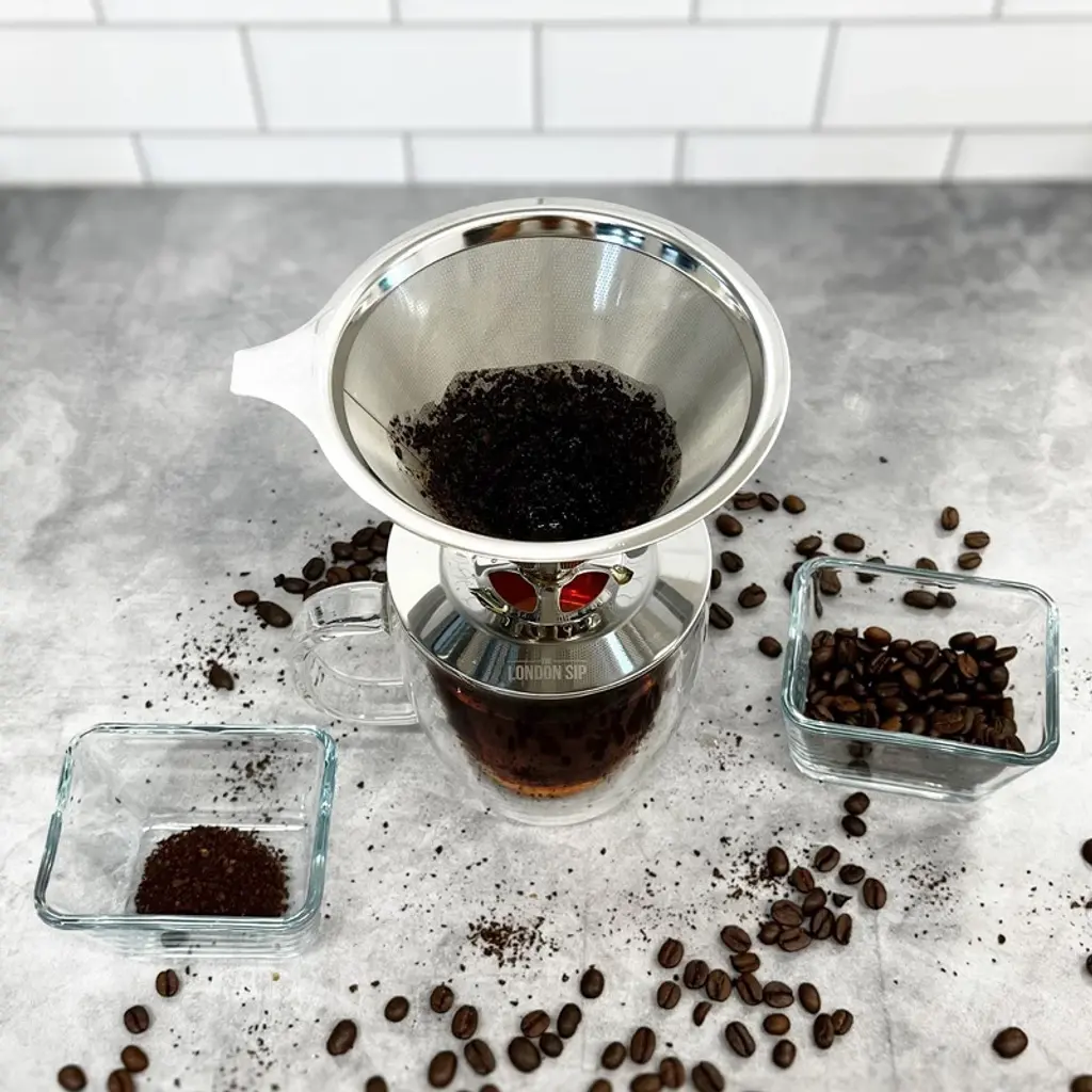 At the London Sip, our mission is to provide you with the highest quality tools to produce cafe-quality coffee and tea from the comfort of your own home. We have designed the perfect stainless-steel pour-over coffee dripper (manual coffee brewer) to allow you to enjoy great pour-over coffee at home or on the go. The stainless-steel construction will not impart any flavors into your coffee like other materials can for a great tasting cup of coffee every time. The dripper utilizes a reusable stainless steel coffee filter that is eco-friendly by eliminating the need for paper coffee filters. In addition to there being less waste, there is zero chance of opening your cupboard in the morning only to find out that you are out of filters and unable to make coffee. The larger size of the reusable filter allows the proper amount of grounds to be used for larger pours while leaving adequate room for the bloom and addition of water. The coffee dripper is extremely easy to use, does not require a specialty filter, and clean-up is a snap. The large base of the dripper easily sits on your cup or to-go mug; add coffee and pour hot water over the grounds. When the brewing process is complete you simply rinse out the dripper and enjoy your coffee. The London Sip 1-4 cup stainless steel pour-over coffee dripper is a perfect addition to your morning coffee routine allowing you to brew a great pour over coffee directly into your cup. This dripper is ideal for those who need to brew more than a single serving of coffee.