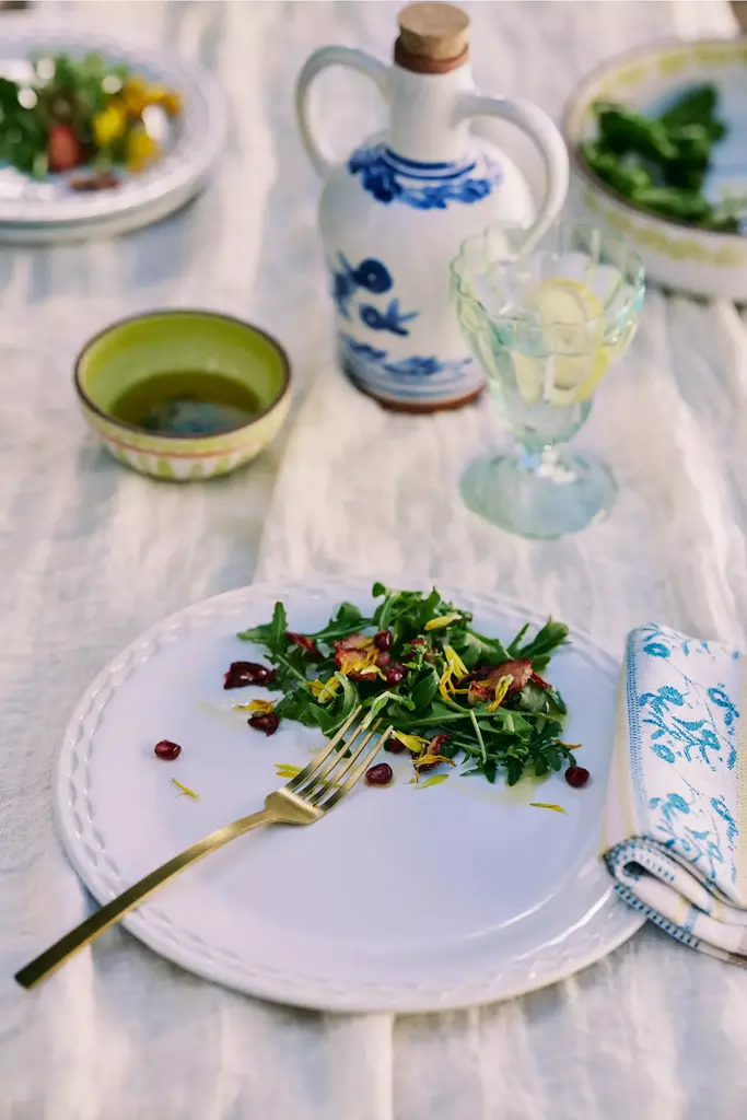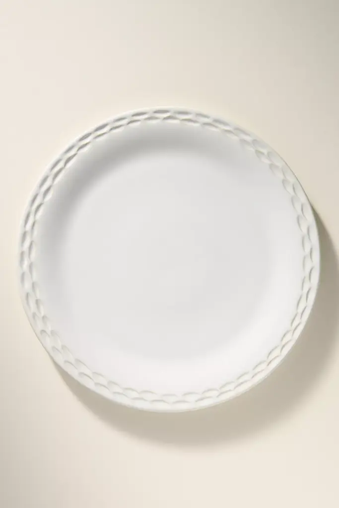 With a chiseled border and a washed blue glaze, these dinner plates set the scene for great food*and* company. Casual and inviting but appropriately elevated. The Mediterranean Dish's *only-at-Anthro* collection echoes the brand's palette of sea, sand, sun, and land, inspired by Suzy Karadsheh's childhood and travels in the Mediterranean.