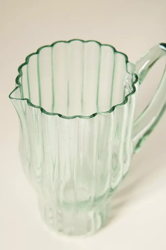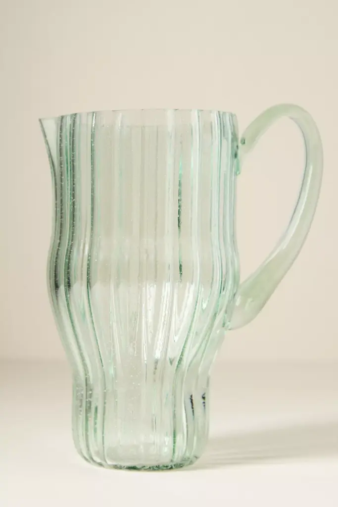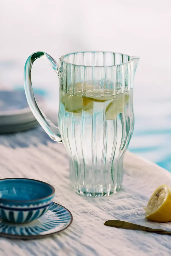 Inspired by the tranquil hues of the sea, this tinted glass pitcher flaunts a subtle ribbed texture, making it the perfect vessel for serving your favorite beverages. Casual and inviting but appropriately elevated. The Mediterranean Dish's *only-at-Anthro* collection echoes the brand's palette of sea, sand, sun, and land, inspired by Suzy Karadsheh's childhood and travels in the Mediterranean.