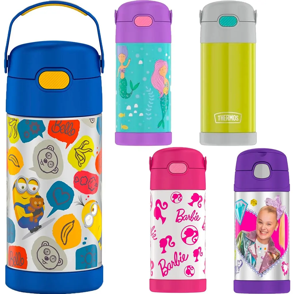 The Thermos 12 oz. Kid's Funtainer Water Bottle features durable stainless steel construction and vacuum insulation technology that keeps drinks cold for up to 12 hours! This bottle is built to handle drops, dings and assorted rough housing. Keep germs away with the hygienically covered silicone straw which is removable for easy cleaning. Sweat-proof exterior. Hand-washing recommended. Not for use with hot liquids. Please Note: Lid style may vary depending on availability. The purple color may vary in shade depending on availability.