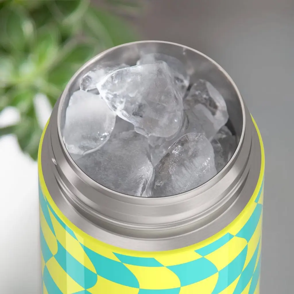 The FUNtainer® 16-ounce Vacuum Insulated Stainless Steel Water Bottle with Spout keeps drinks cold for up to 12 hours. The double wall stainless steel construction is built to handle drops, dings and assorted roughhousing. Includes a soft touch carry handle, making it easy for kids to carry with them throughout the day. This 16oz. FUNtainer Bottle includes a redesigned spout for a more comfortable drinking experience and a locking ring to help secure the lid in place. Keep germs away with the hygienically covered drinking spout. To clean, you can pop your FUNtainer water bottle in the dishwasher; however washing by hand is recommended.