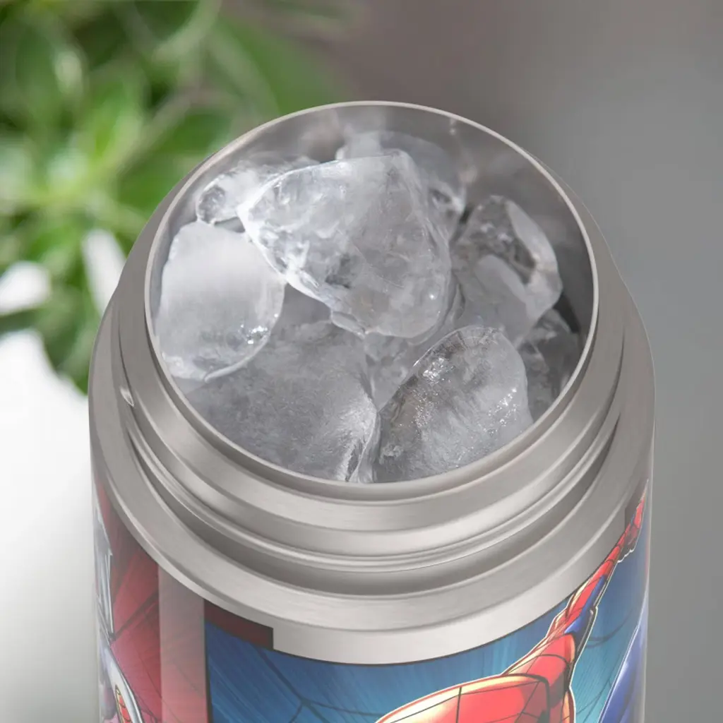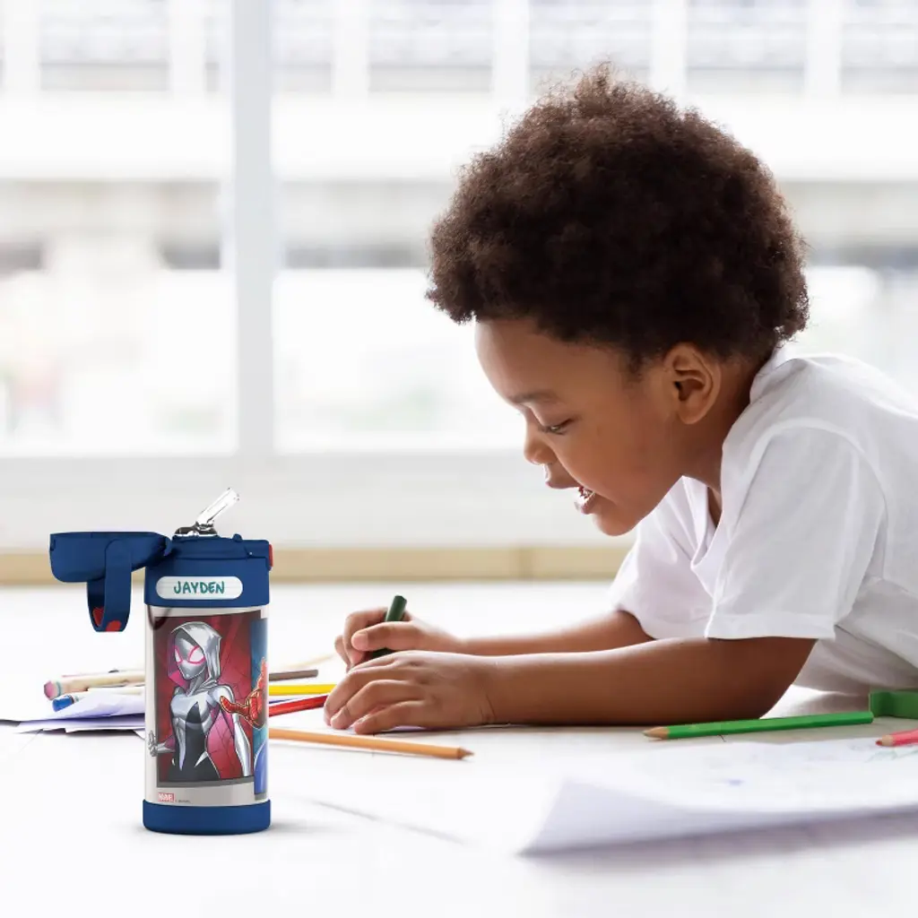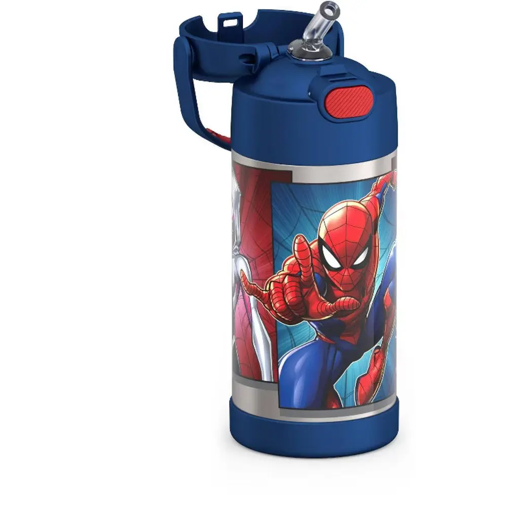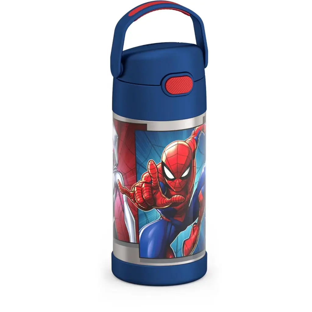 Add your kid's favorite character to their essentials with the Thermos 12-Ounce FUNtainer Water Bottle with Bail Handle. Vacuum-insulated, this stainless steel water bottle keeps drinks cold for up to 12 hours and comes with a silicone straw for convenient drinking. Made with BPA-free materials, this double-wall water bottle features an integrated carry handle with soft-touch grip to make it easy for kids to carry, and the handle can also be folded down when not in use. Designed with fun character prints, you can pop the FUNtainer water bottle in the dishwasher for easy cleanup.