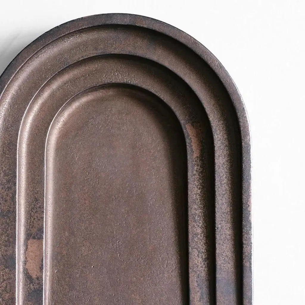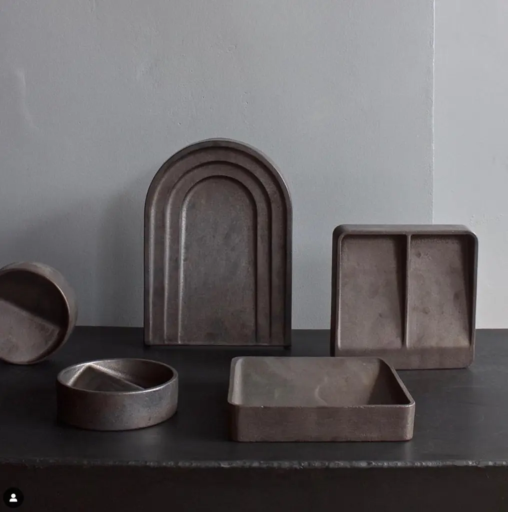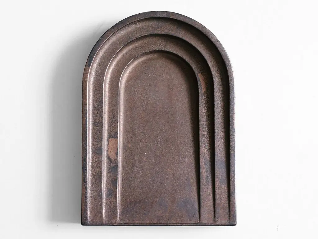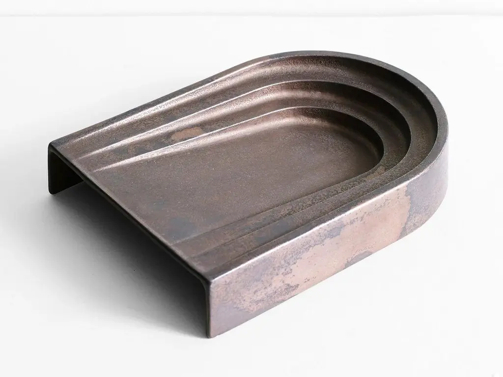 Blackened Thoronet Dish by Henry WilsonDimensions: W 20 x D 5 x H 30 cmMaterials: Bronze (Blackened)Thoronet dish, shares its' name and arched lines with the Abby in the south of France. It is made, polished and finished in Sydney, Australia in solid Aluminium.Sand casting is as much about negative space as it is about form, This piece can be stood up as a display object.Each casting is manufactured in small batches meaning slight variations will occur from piece to piece. Production marks may include slight pour ripples or surface pitting.Heat treatment gives a blackened finish which will oxidise and further darken over time to reveal a distinctive patina. Simply use a metal polish to return it to it's original blackened state. Do not use scouring pads.Henry Wilson's work combines a rational, democratic utility with an element of sculptural expression. There is a clear form and function in our products, but it’s important they also have feeling. We are interested in the awkward beauty that comes from something made by hand. We like to explore how imperfection can be introduced into an industrial process, to make something at scale that retains a sense of individual charm.Permanent Collections and Exhibitions- Museum of Applied Arts and Sciences, Sydney, Australia- Art Gallery of Western Australia, Perth, Australia- 'Sempering' XXI Triennale, MUDEC, 2016, Milan, Italy.