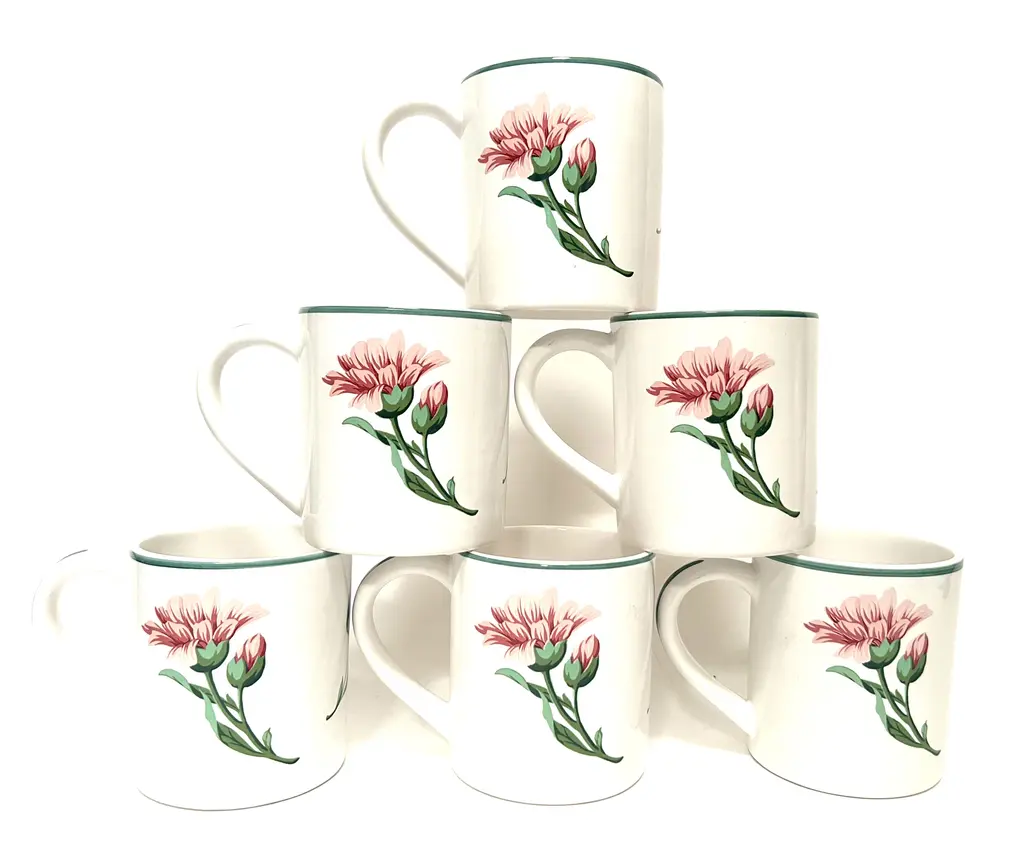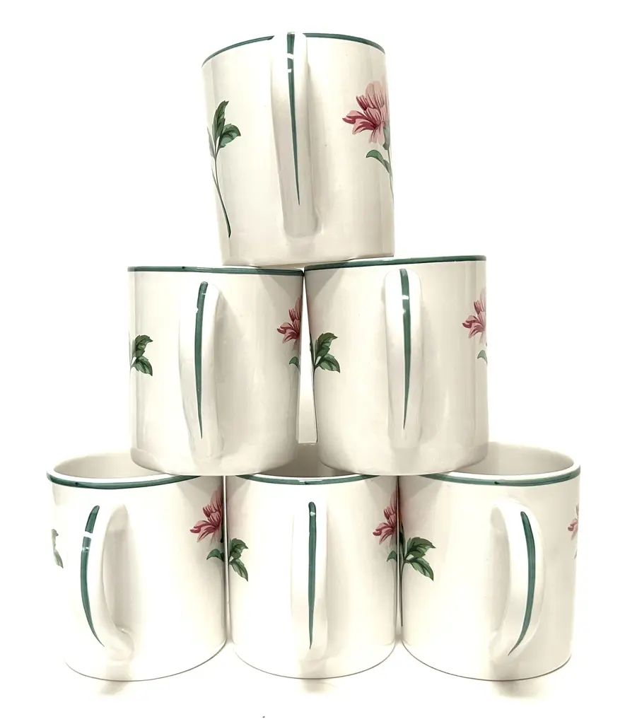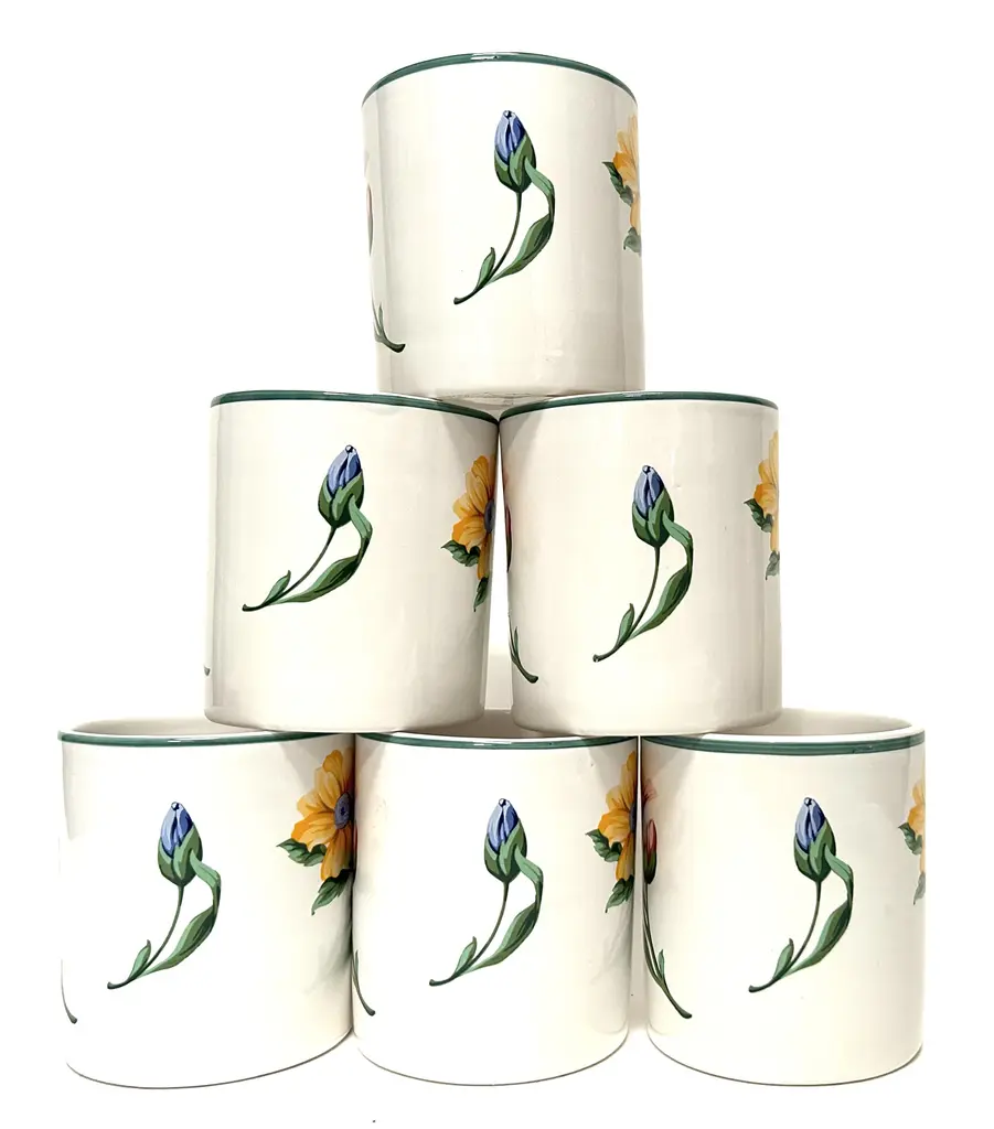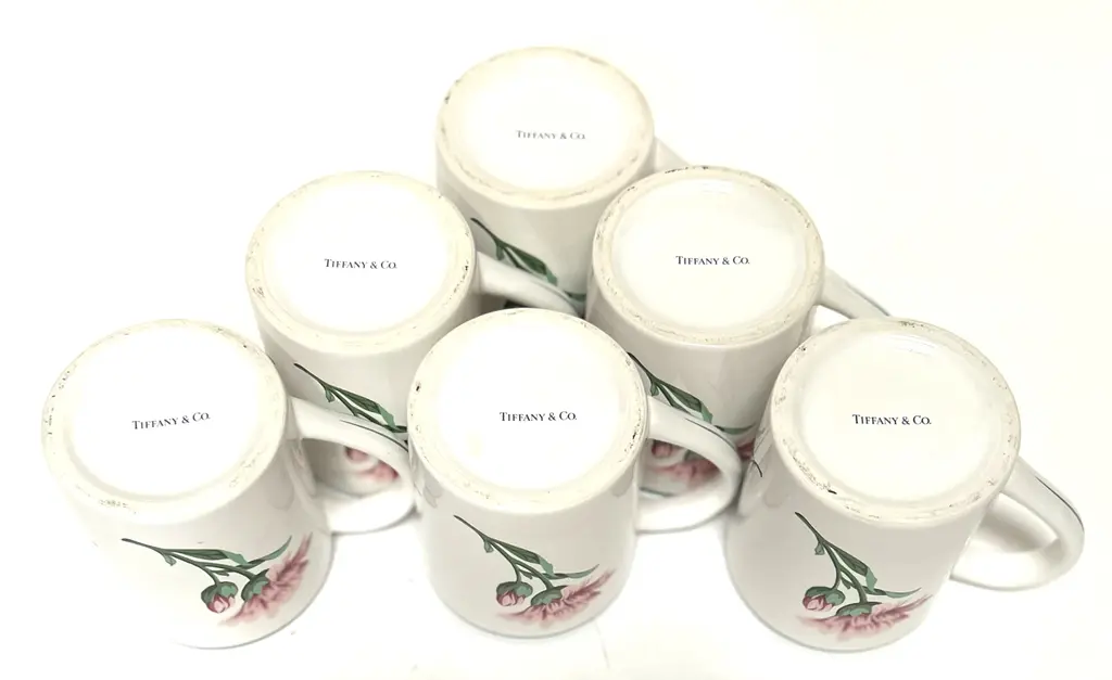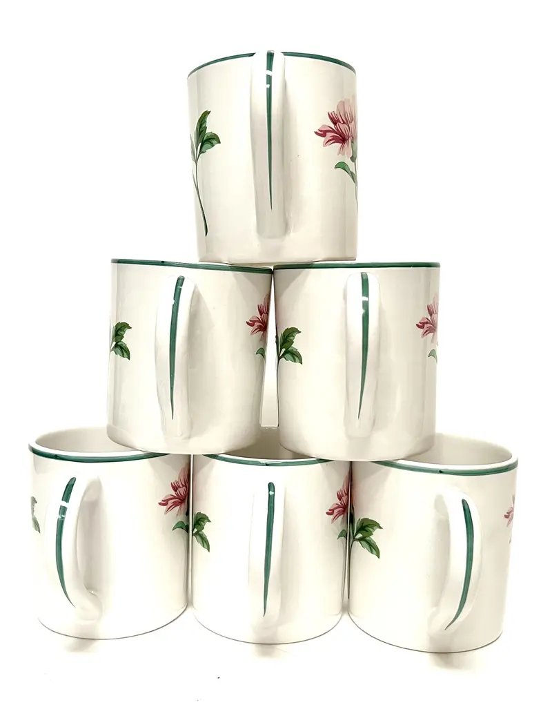 Set of six Tiffany & Co. faience mugs in the glorious Sintra floral design with painterly flowers on all sides and pretty green rims. Marked “Tiffany & Co.”