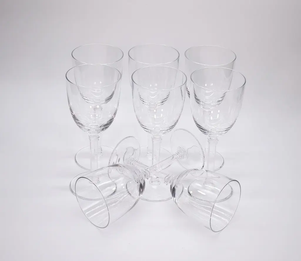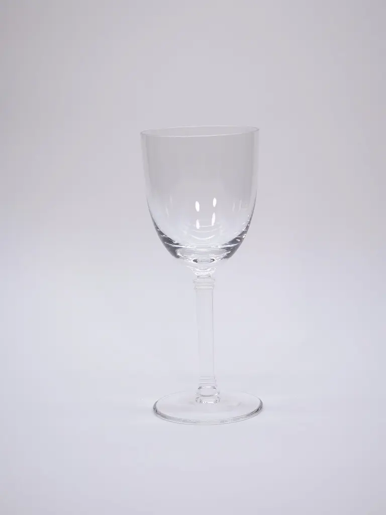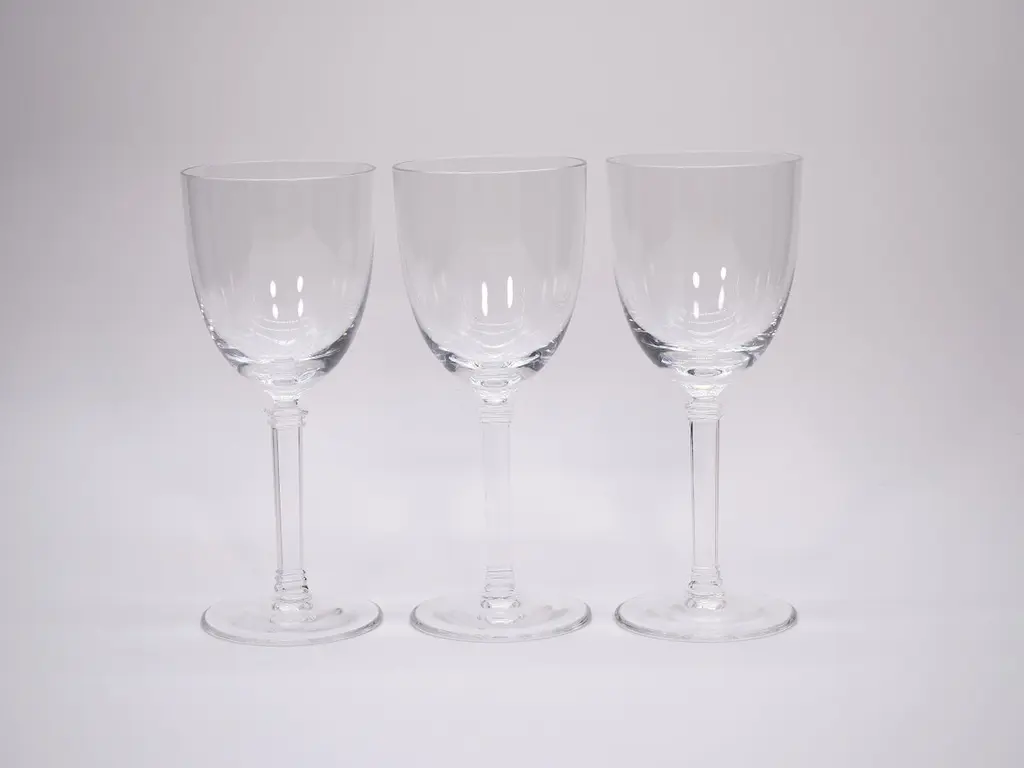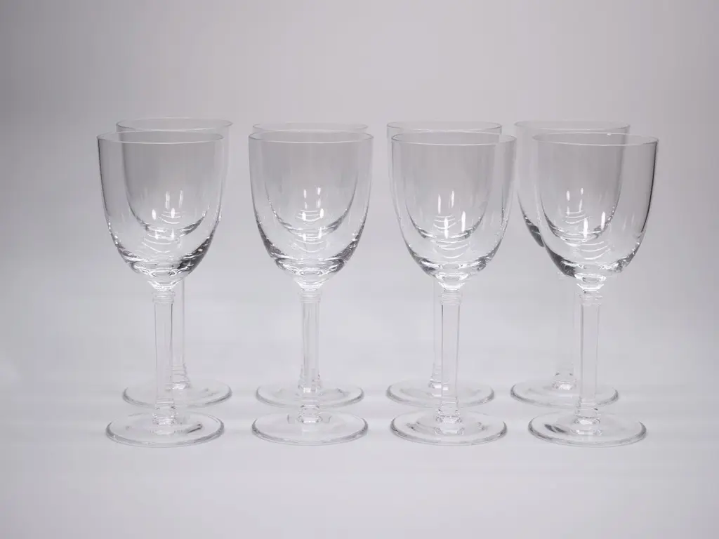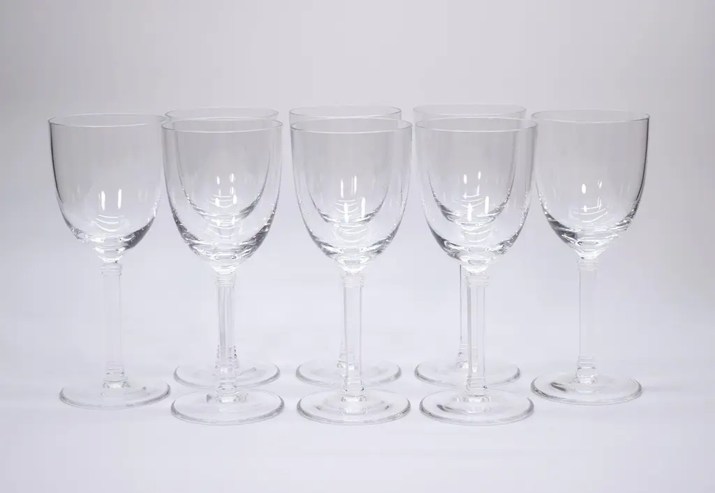 Exquisite Tiffany Crystal Mid-Century Modern barware, Tableware wine or water glass. We are selling individually. Each glass is $1400 per and we have fourteen pieces available. These glasses are very bold yet simple in an art deco style and can add a terrific silhouette to any table or any bar cart when paired with other shape or the same Hampton design. Each glass in excellent condition. Maker's mark undersigned. Each one measures about 8 inches high x 3 1/2 inches in diameter.