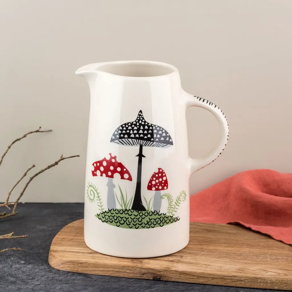 The toadstool tall jug is designed in the uk by hannah turner. The stately lines of this tall jug create a larger pitcher to compliment the creamer jug and the baby jug, also available in this pattern. The elegant toadstools and foliage adorning the jug on each side really bring it to life. We find it is great for cut flowers as well as being large enough to hold 2 pints of milk, so ideal for cereals at breakfast time.It comes in a beautiful gift box, so perfect for birthday or Christmas presents, or just a treat for you?The toadstool tall jug is just part of hannah turner's beautiful range of toadstool tableware.