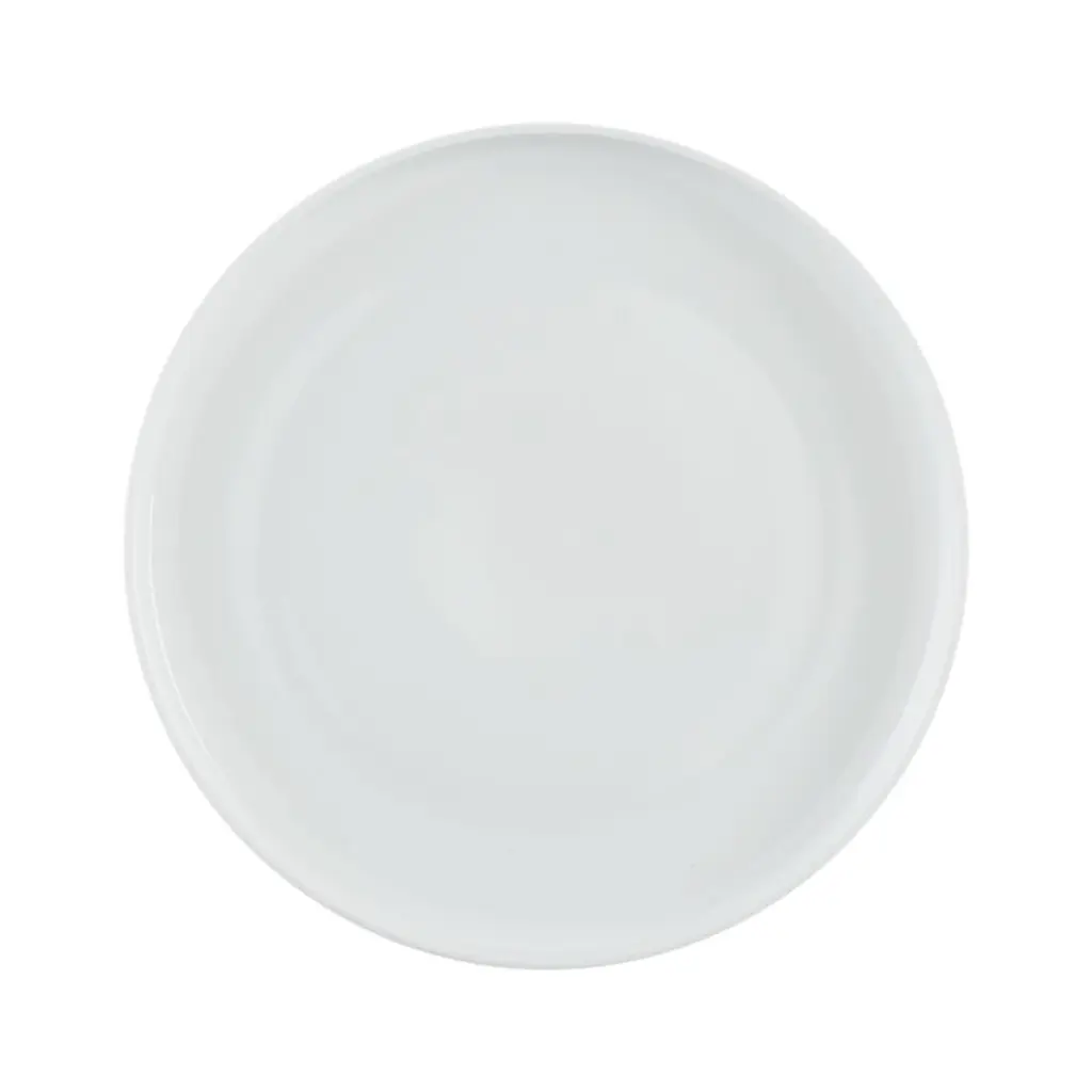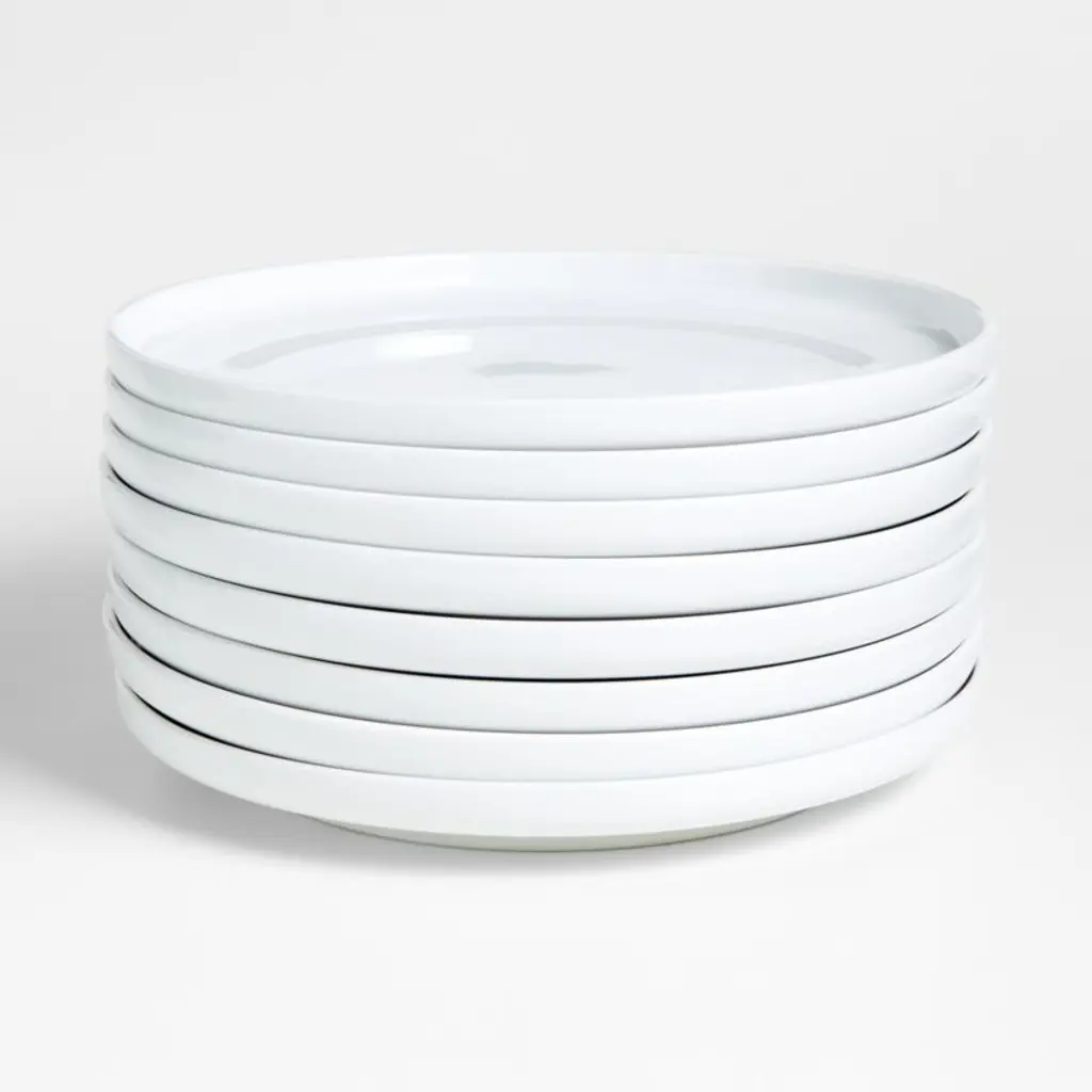 Crisp white porcelain dinner plate trends modern and flexible in a modern, rounded coupe shape perfectly at ease in casual and formal settings. This streamlined plate, a Crate and Barrel exclusive, works beautifully for casual lunchtime sandwiches and elegant dinner parties. Low curves allow for easy stacking and space-saving storage. For a coordinated table, pair with our Toben serving pieces.