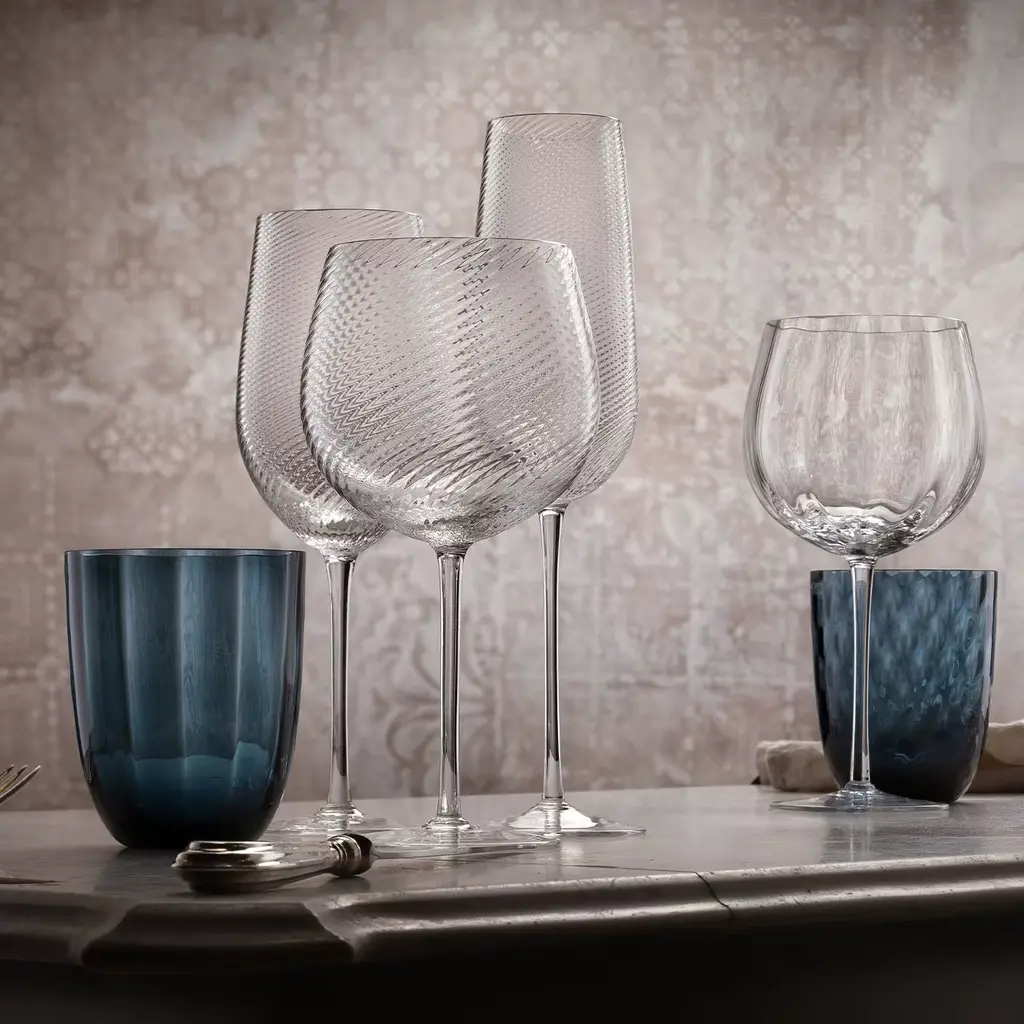A subtle optical texture lends this transparent red wine glass its effortless elegance. Mouth-blown from fine Murano glass, it belongs to the Tolomeo Collection of singular pieces each flaunting a different texture borrowed from century-old Venetian tradition. Any slight variation from the pictured item is to be expected and treasured as proof of its artisan quality.