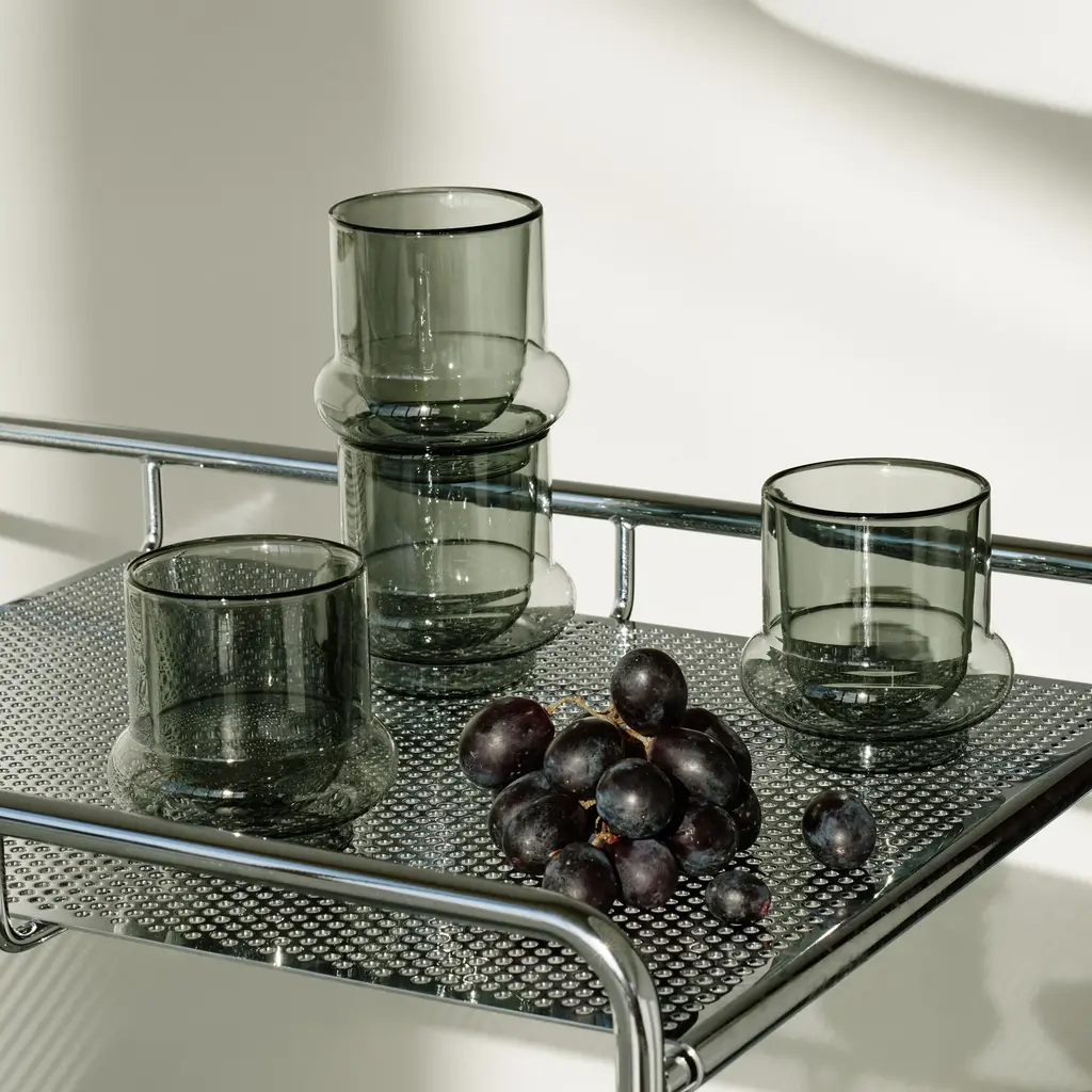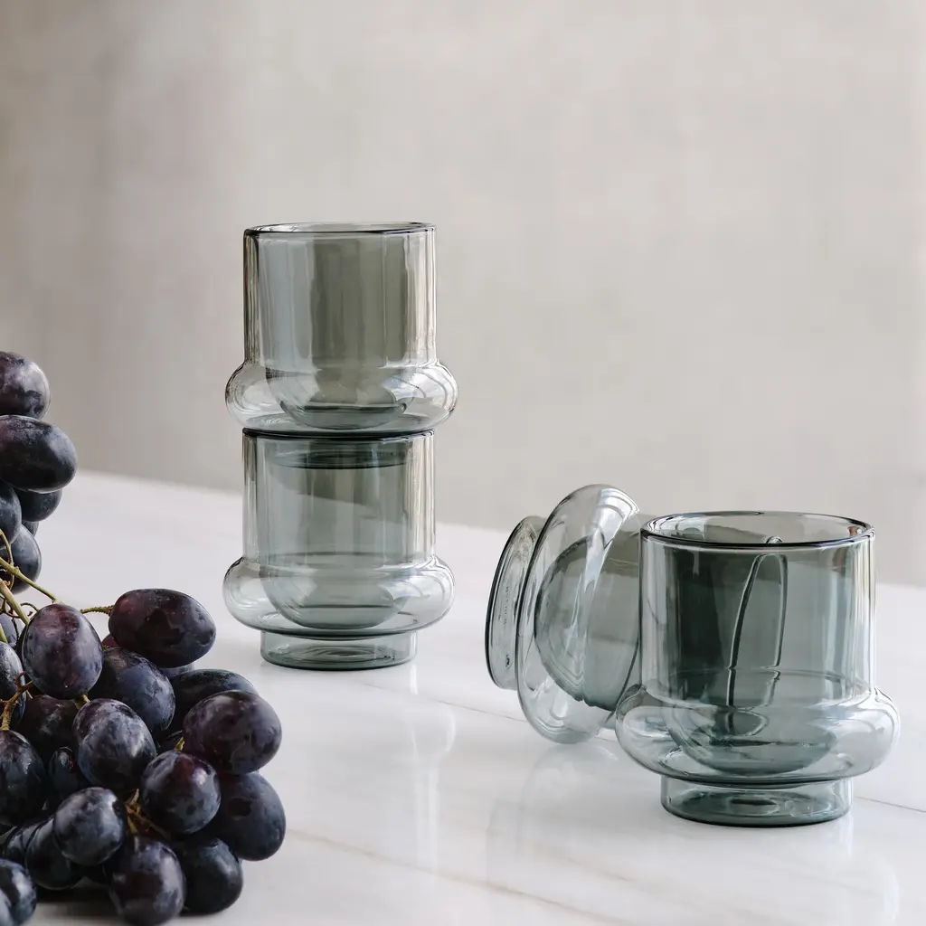 Bring elegant form and function to your tea and coffee time with this set of two Bump Insulated Glass Coffee Cups by designer Tom Dixon. They’re handcrafted with care from translucent gray borosilicate glass that’s known for its durability and heat resistance. Tom Dixon is a designer with work in MoMA’s collection. Each Bump Glass Mug measures 4.3h x 2.75"diam. and holds 6.8oz. Hand wash only.