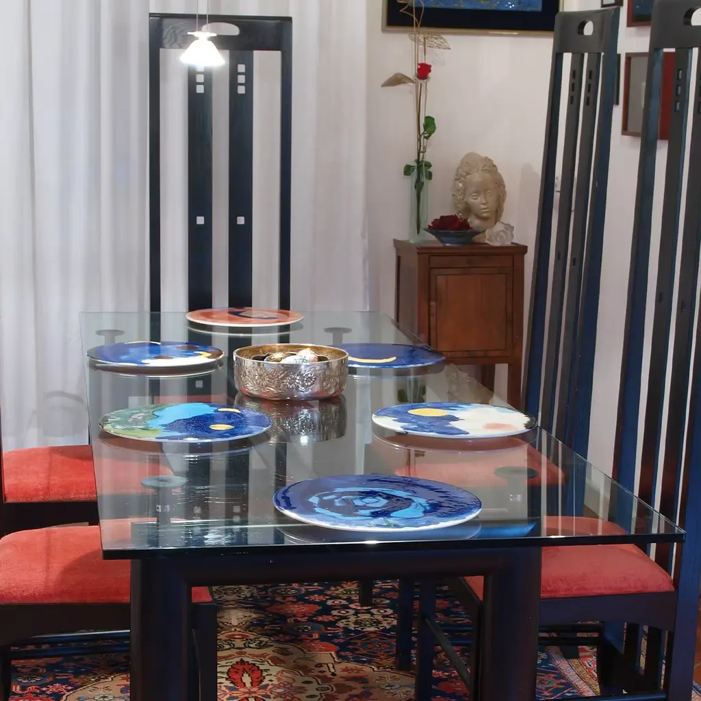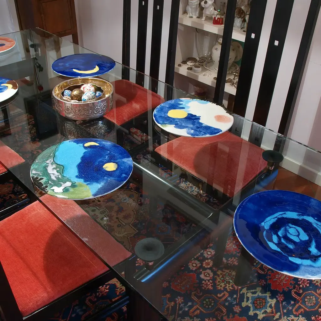 Handcrafted from the finest Faenza majolica, this charger plate will lend a striking imaginative allure to any table. A hypnotizing array of blue and light-blue glazes seems on the edge of absorbing the subtle urban profile that delicately still accents the rim. Ideally displayed as a purely decorative piece, this charger plate belongs to the "Ceramica in Tavola" Collection of exquisite tableware with a distinct artistic personality.
