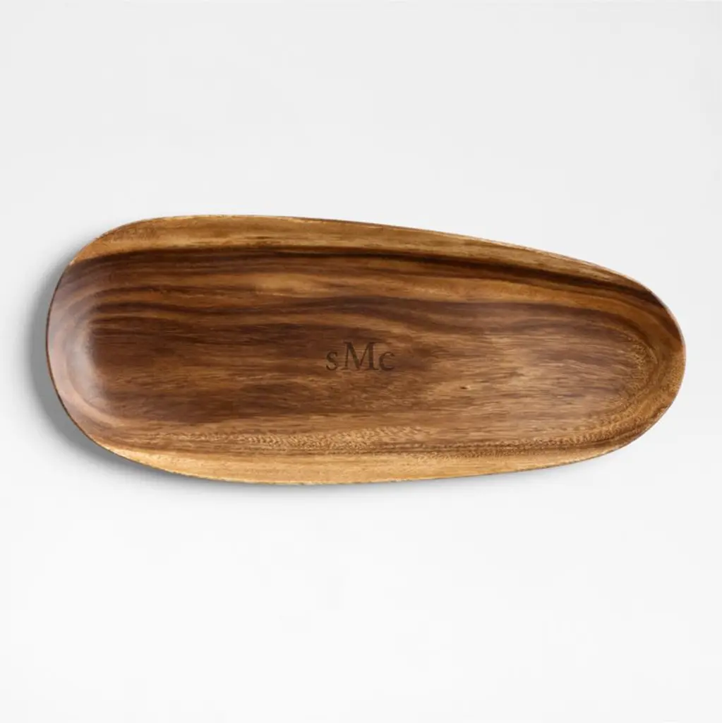 Richly grained acacia wood turns out Tondo's smooth, sculptural serving essentials, naturally suited to everyday use, entertaining or artful display. The organically shaped platter is hand carved from a single piece of wood into an asymmetrical oval that's generously sized to host a cheese spread, appetizer selection or centerpiece arrangement. Each large oblong platter is given a clear lacquer finish to bring out the warm color and one-of-a-kind markings. For a beautifully coordinated table, pair the platterwith the other acacia serving pieces in our Tondo collection.