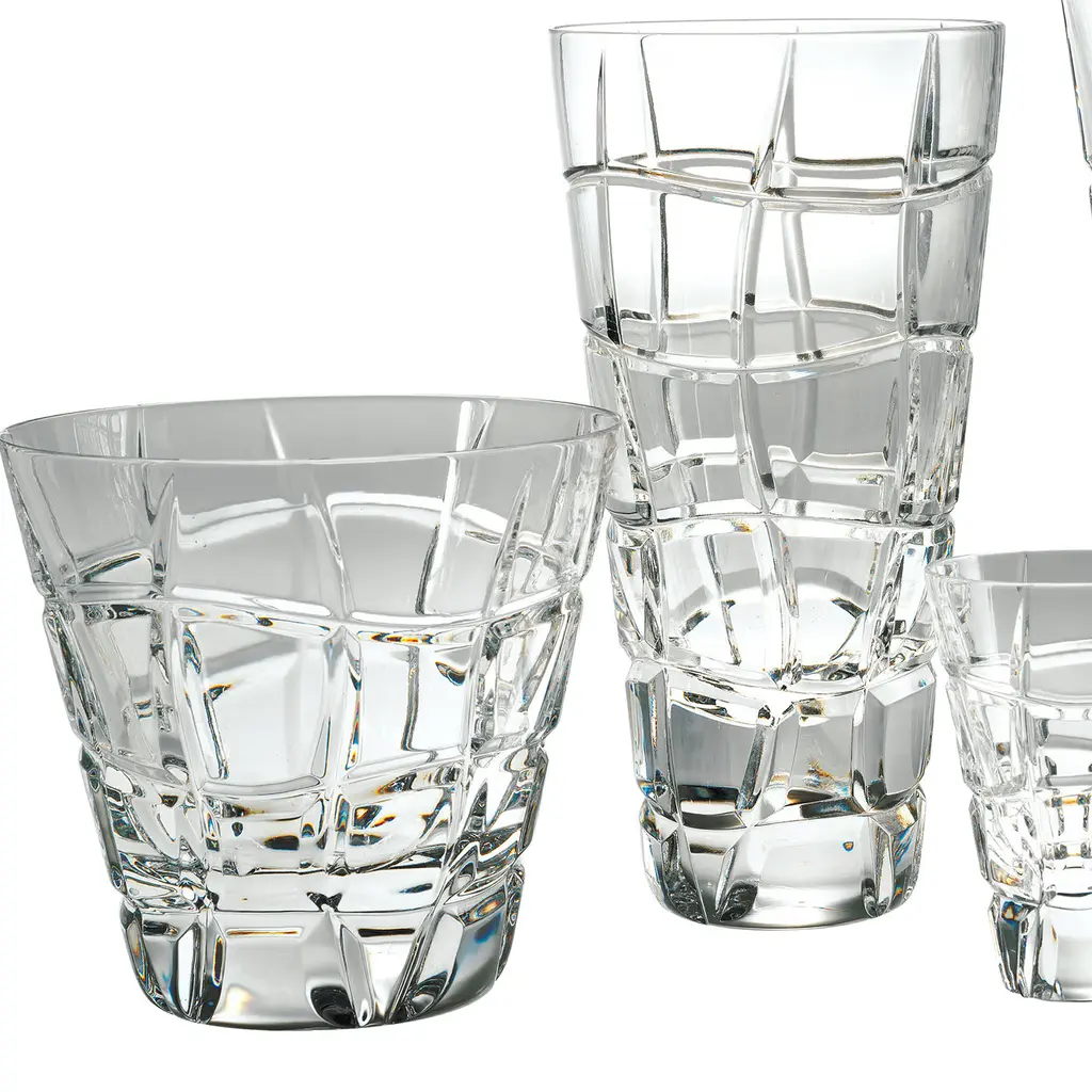 This set of two liquor glasses will be an ideal choice for a sophisticated cocktail, or a refined after-dinner drink. Particularly suitable for a modern interior, this set can be combined with the other items in the same series for a complete look. Their transparent crystal silhouette is marked by a series of crossing cuts with a satin finish that enliven their surface creating a textural decoration.
