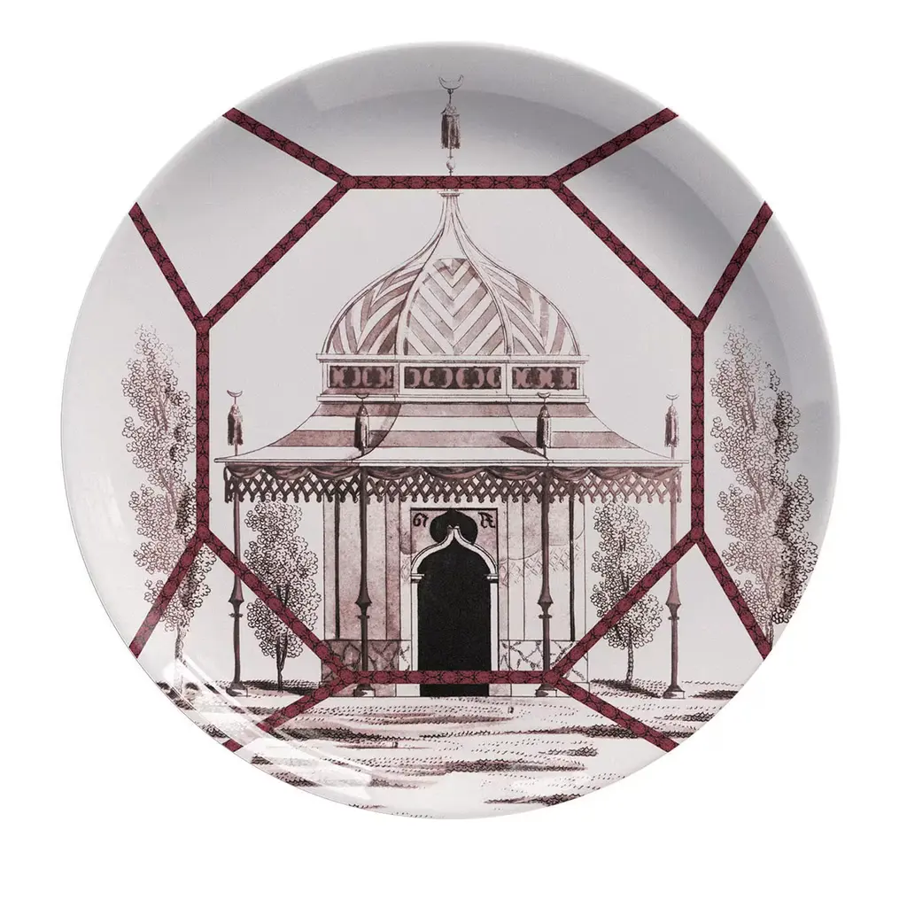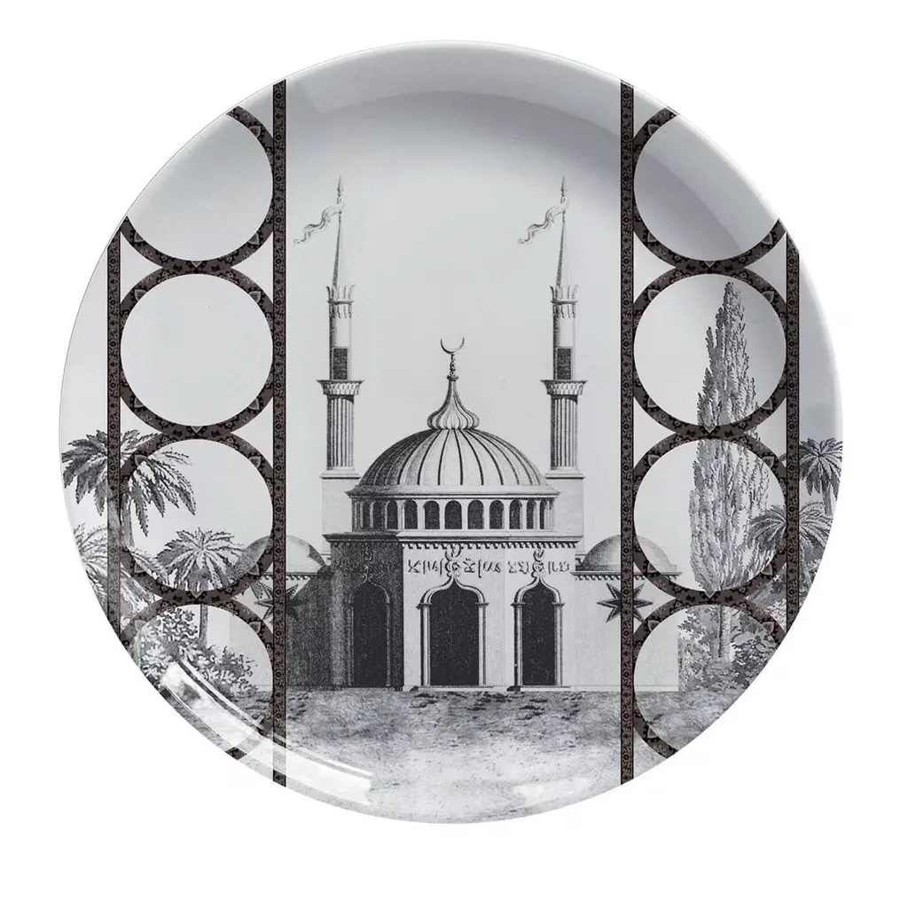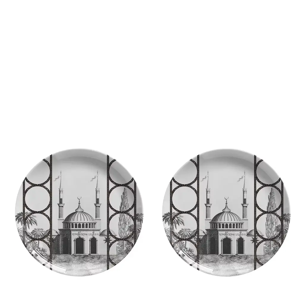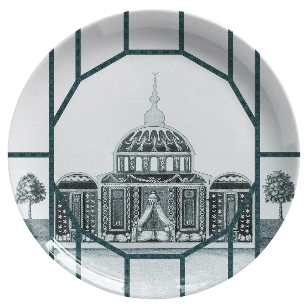 Elegant and refined, these two dessert plates are part of the Topkapi collection of porcelain pieces with six distinct designs and colors. Their stunning sophistication boasts a delicate sense of mystery, rendered by the view of a detail of the Sultan's palace and gardens as seen through the geometric pattern of a gate. The lavishness of the Ottoman court is rendered in astonishing fashion to imbue any occasion with exquisite allure.