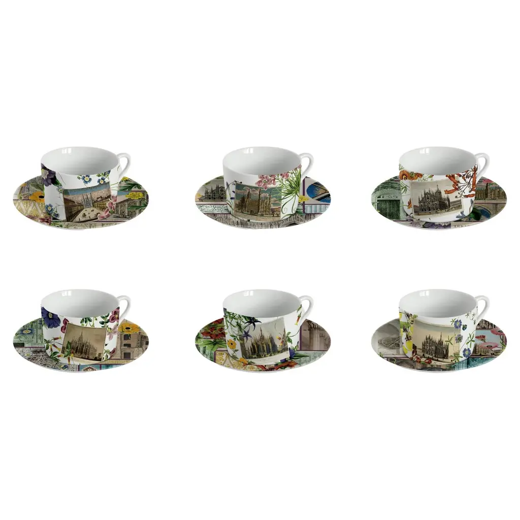 Part of the Topkapi collection, this set is an ensemble of six porcelain plates that will imbue any occasion with the charm and mystery of the eponymous palace in the heart of the Ottoman Empire. The world of 15th century Constantinople is recreated in these designs that show different views of buildings, tents, and gardens as seen through gates. Different pastel colors form the background of six distinct scenes, depicted in stunning black and white details. Either to enliven a tea break or an after-dinner dessert, these pieces are a stunning addition to a contemporary or modern decor.