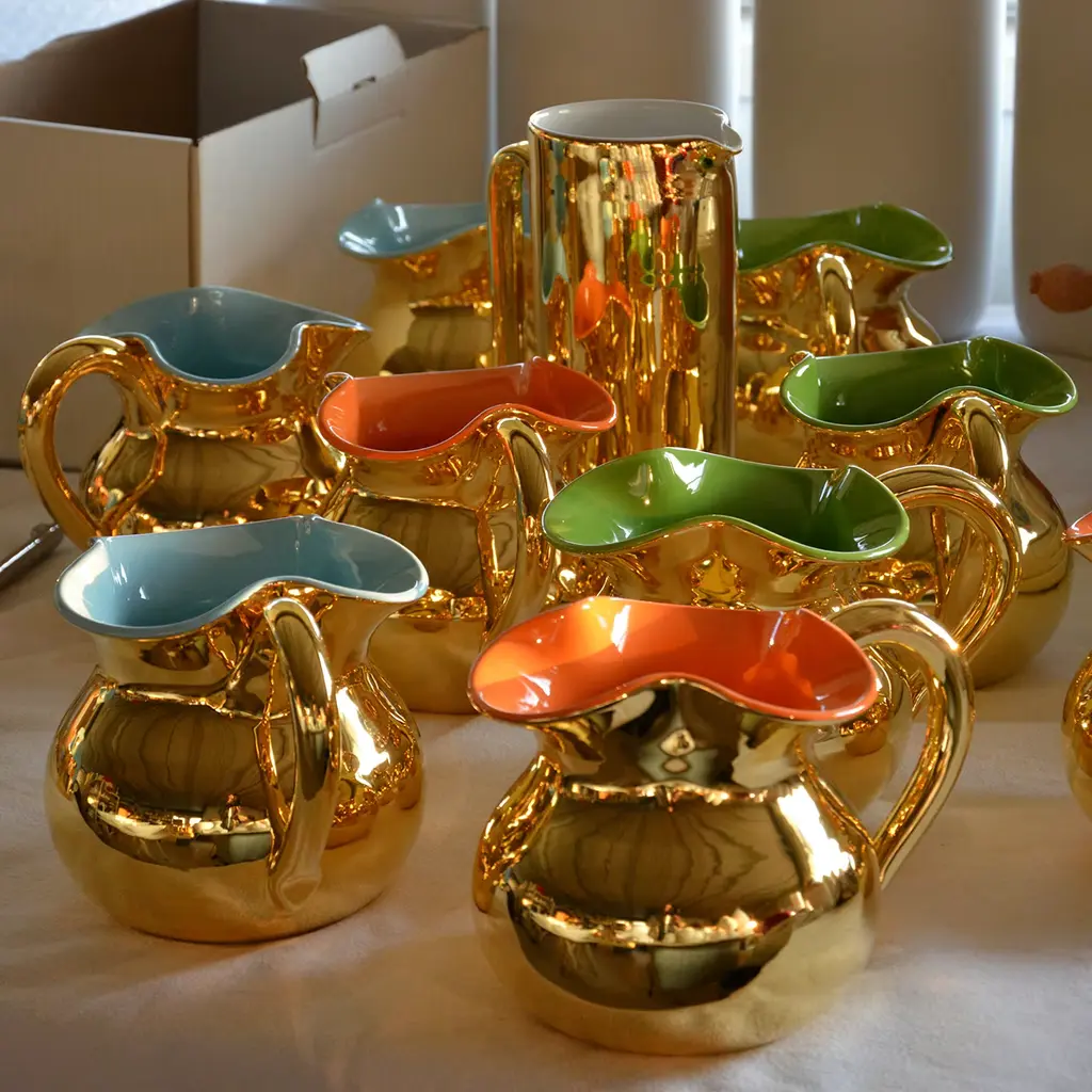 The 24 K Gold Torcello Carafe is the timeless best seller of Tuttoattaccato collection. Deeply rooted in Venetian Tradition, the Torcello pitcher is a fine example of elegant and original craftsmanship. Handthrown in white terracotta and uniquely shaped by hand, the 1.2 L carafe is fired three times up and finished in a 24 K gold glaze applied using a soft bristle brush. Enhance your living space with Torcello's vibrant design.