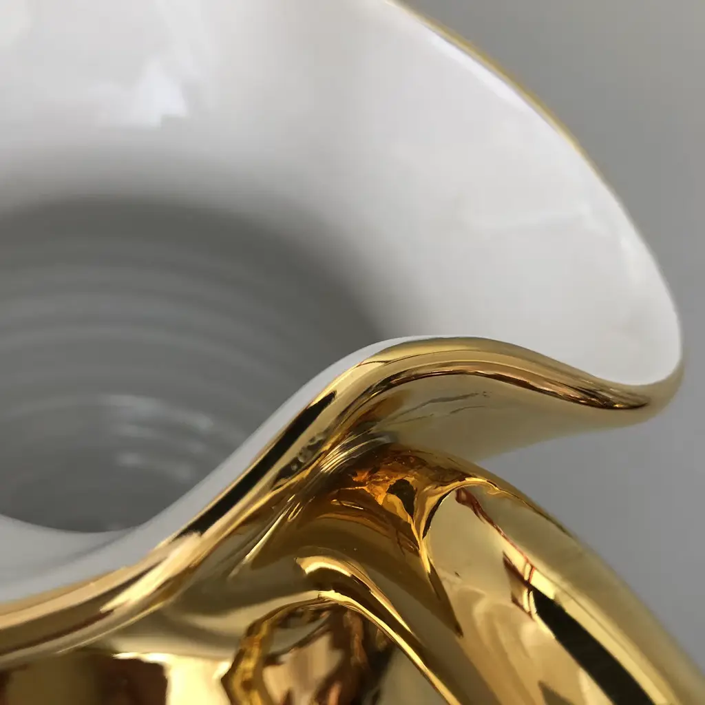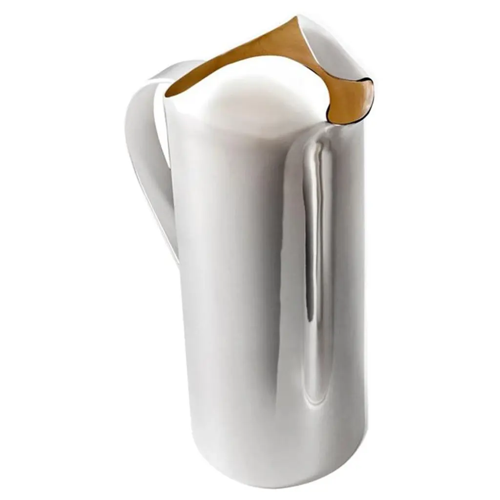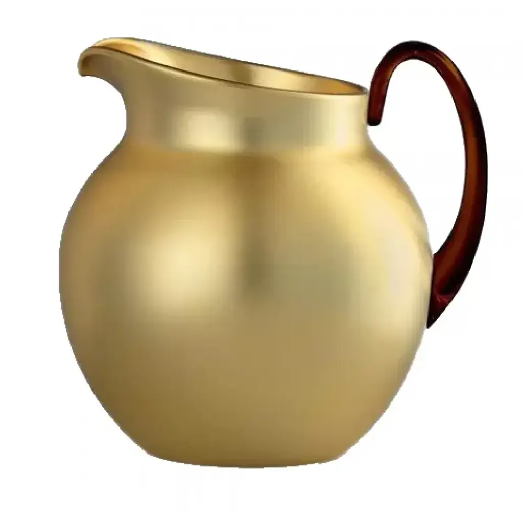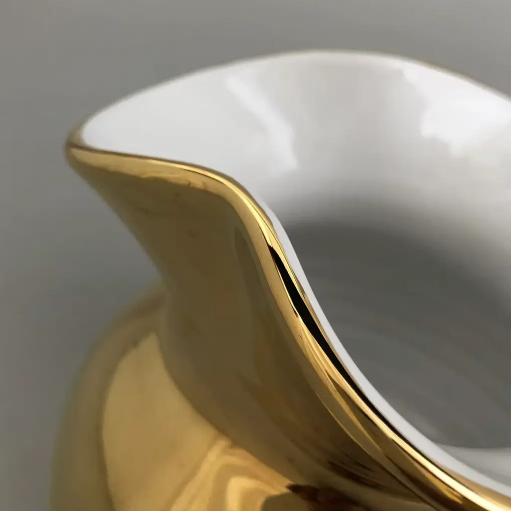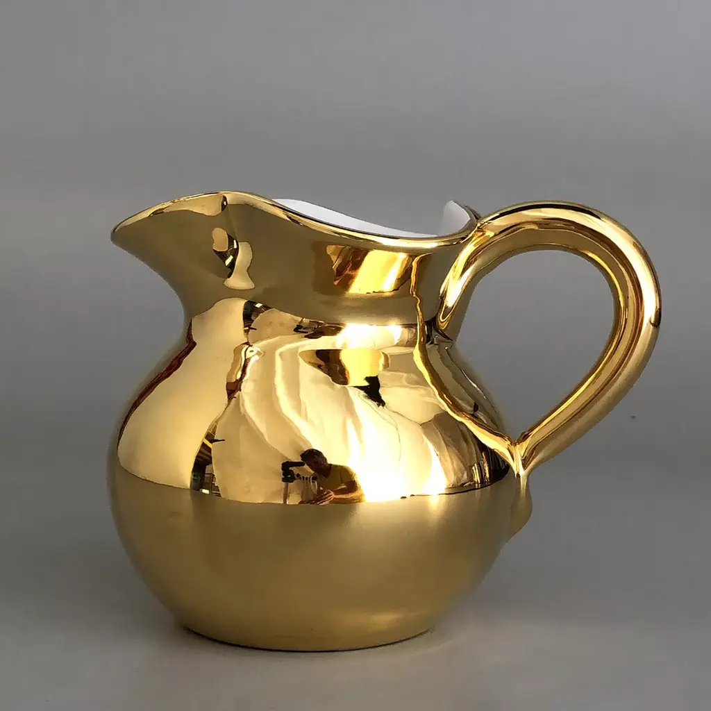 The Torcello Carafe is a fine example of elegant and original craftsmanship. Handturned in white terracotta and uniquely shaped by hand, the 1.2 L carafe is finished in a gold glaze applied using a soft bristle brush. The item may be customized with a short piece of text on the underside.