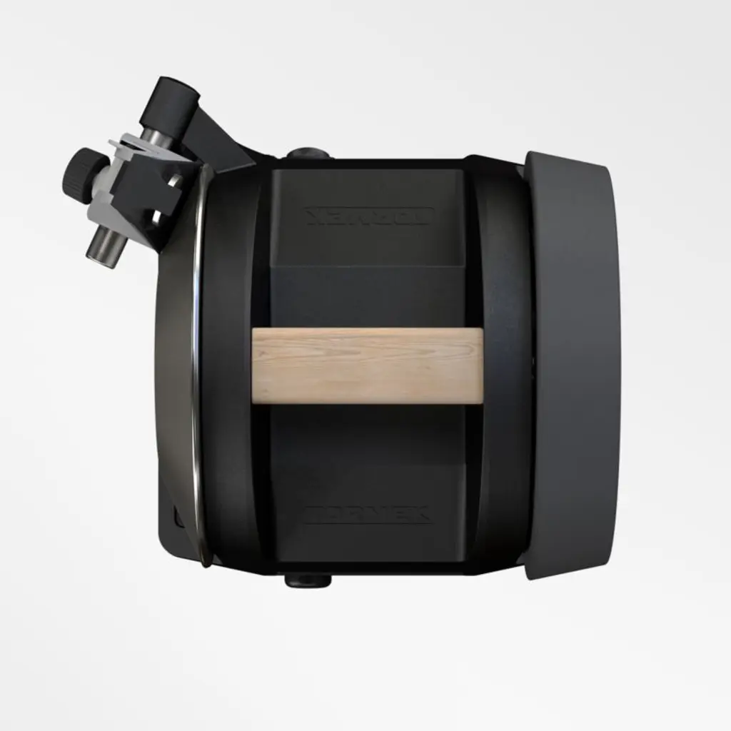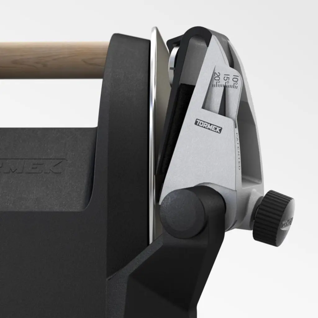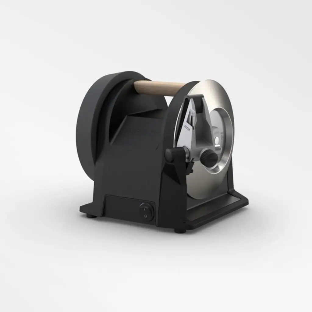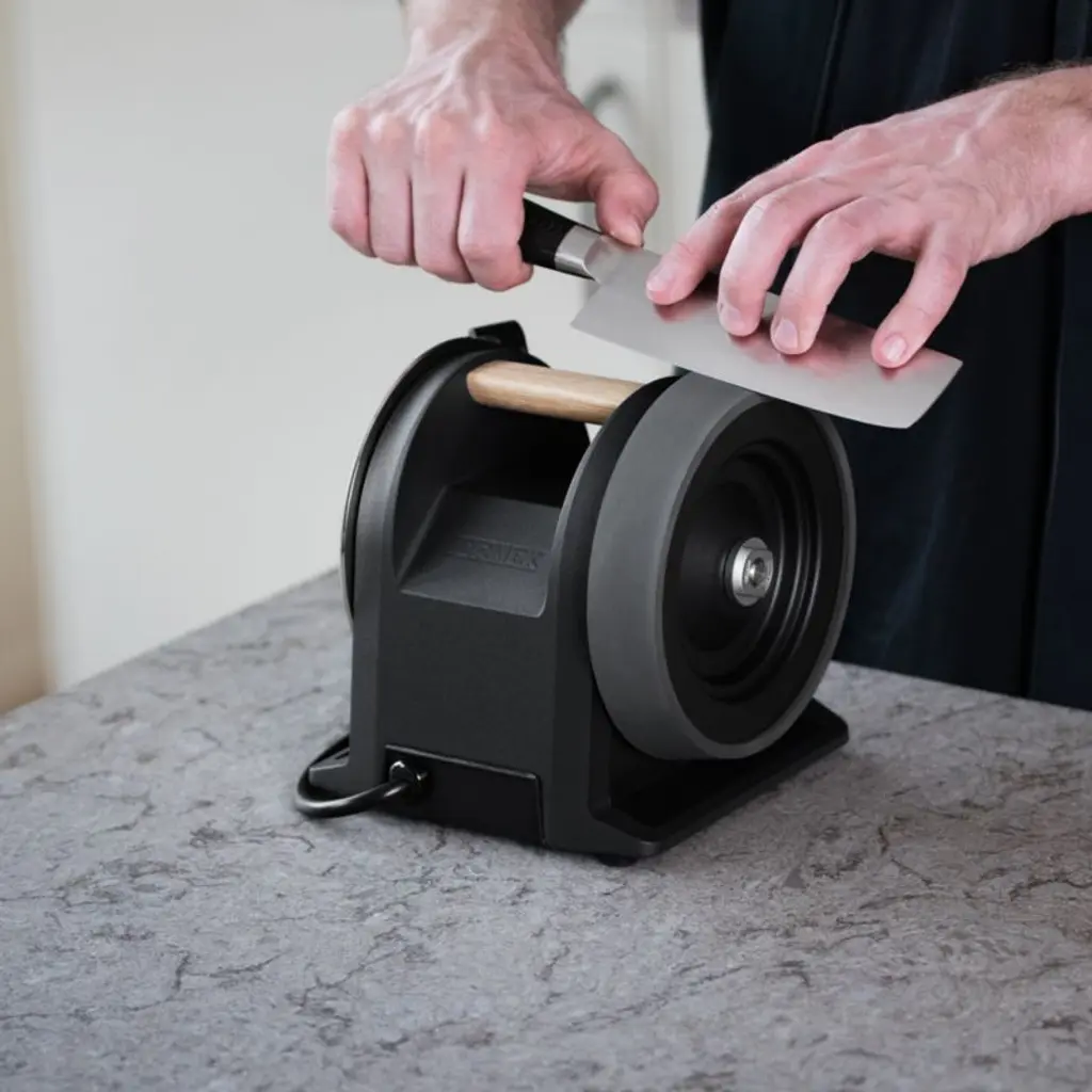 Get all of your knives in restaurant-worthy shape in moments using this chef-designed sharpener. The diamond-coated grinding wheel shapes blades to your desired angle, then the composite honing wheel creates razor-sharp edges as it polishes the entire blades. The built-in magnet collects steel particles to eliminate mess as you work. Outfitted with a sturdy oak handle and carbon-black finish, the motorized Tormek T-1 sharpens knives quickly and quietly.