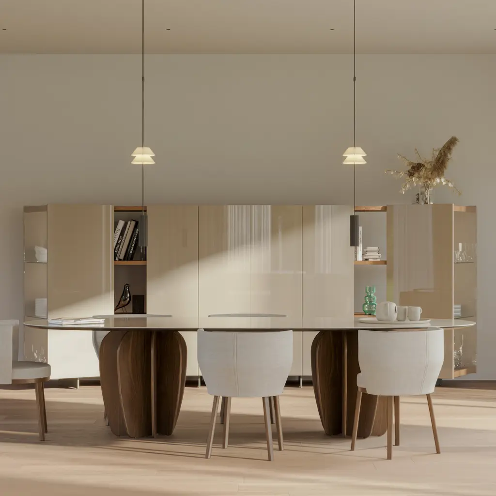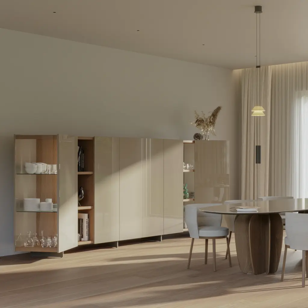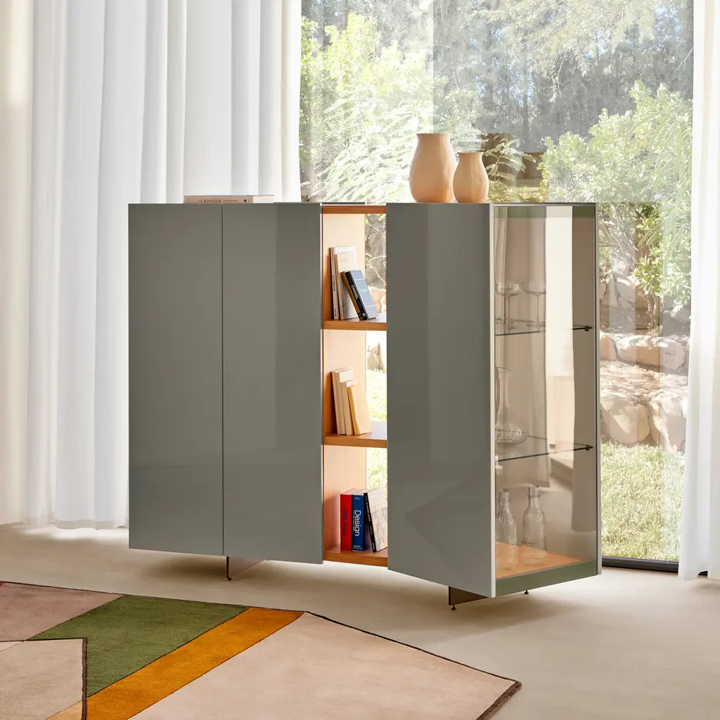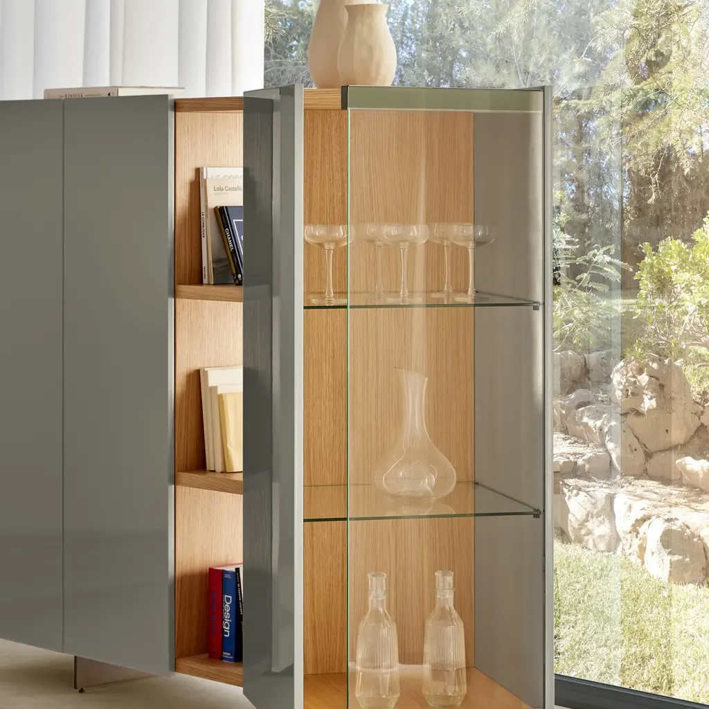 The Firenze cupboard introduces an innovative spatial design with its unique obtuse angle shape, allowing it to project into the room rather than sit flush against a wall. This design underplays the storage volume, creating new possibilities for space utilization. The cupboard features a handcrafted oak veneer cover with precisely joined corners, and glass sides that enhance its visual lightness by displaying its contents. An internal LED system, activated by door movement or a motion sensor, illuminates the interior upon opening.