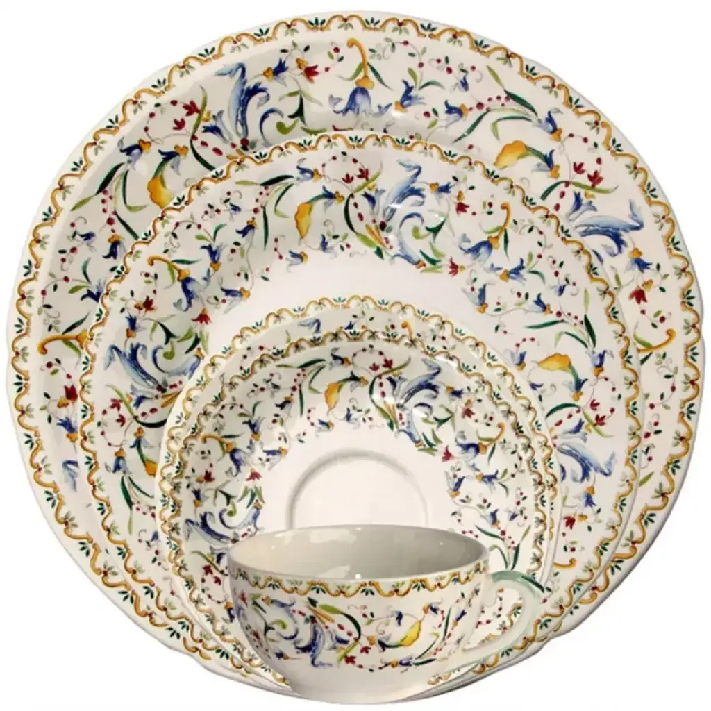 Based on patterns created in 1875, Toscana is a festive pattern of blue and yellow painted on a warm French faience body. Earthenware. Made in France by Gien. Four-piece place setting includes dinner plate, dessert plate, bowl, and mug. Five-piece place setting includes dinner plate, dessert plate, canape plate, US tea cup, and saucer. Located near the Loire Valley castles, the Faïencerie de Gien has been synonymous with prestigious faience tableware and decorative objects since its founding in 1821. Gien pieces are renowned for their warm white clays decorated with traditional motifs reminiscent of the French countryside.