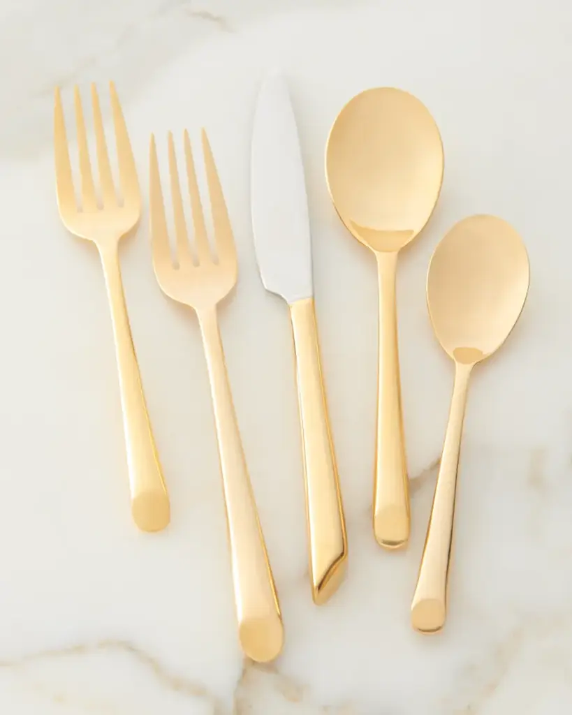 24-kt. gold-plated 18/10 stainless steel flatware. Service includes four 5-piece place settings (salad fork, dinner fork, dinner knife, dinner spoon, and teaspoon). Dishwasher safe; hand washing recommended. Imported. About Towle® Silversmiths From its beginnings on the banks of the Merrimack River in 1690, Towle Silversmiths has maintained an enduring tradition of fine craftsmanship in sterling silver and stainless steel flatware for over 300 years. This remarkable heritage is reflected in the outstanding character, magnificent detail, and incredible balance of every piece bearing the Towle® name. Crafted by an elite group of artisans, each piece of Towle is exceptional in quality, with a beautiful balance of form and function. Towle offers both updated and traditional designs that are made for entertaining yet perfectly practical to use every day.