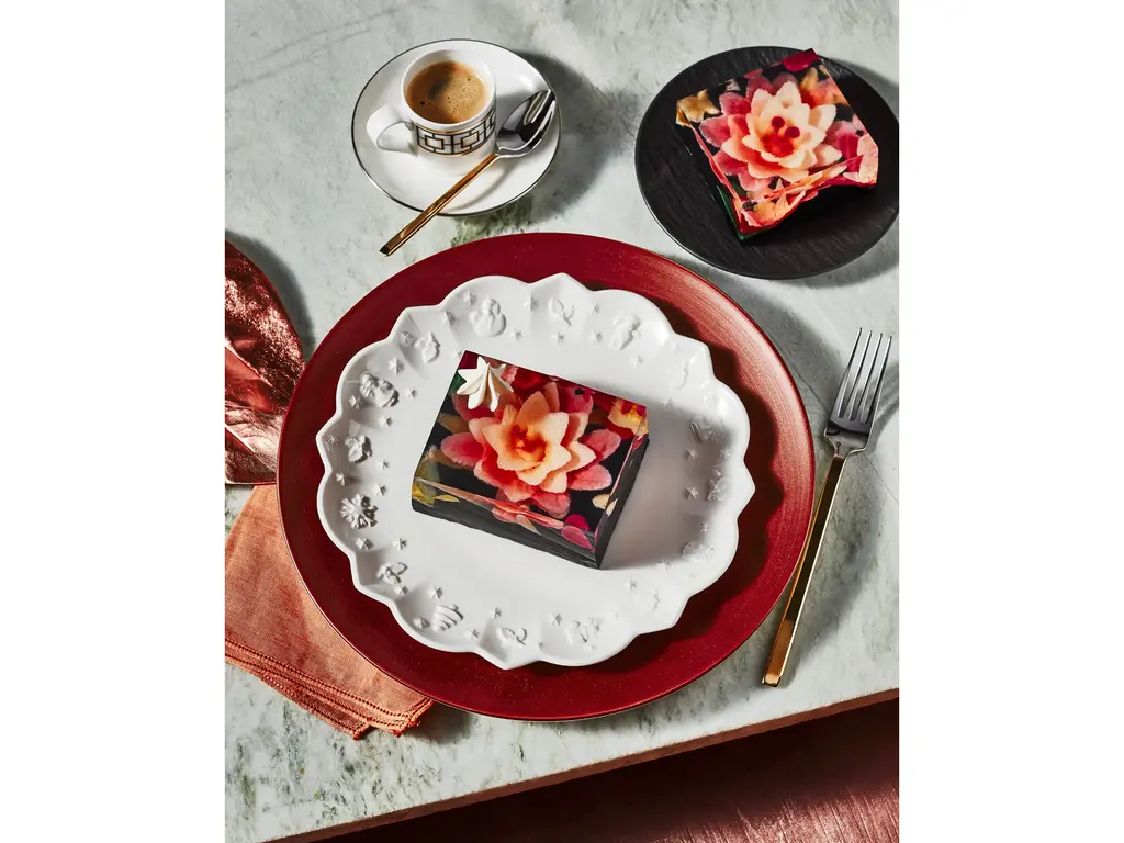 Characterized by scalloped edges and a beautifully embossed holiday motif, the Toy's Delight Royal Collection brings the spirit of the season right to your dinner table.
