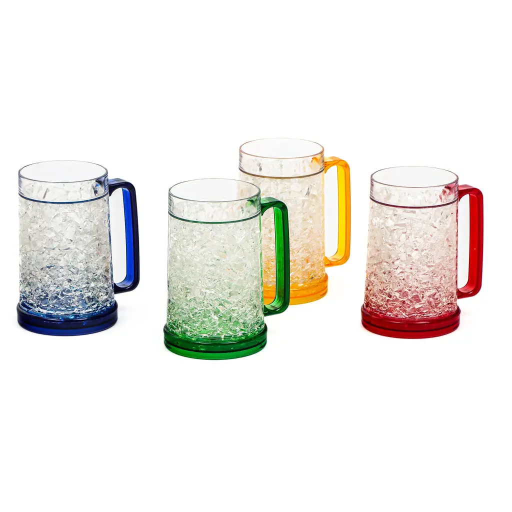 Enjoy ice cold drinks without having to water them down with ice cube using these double walled gel freezer mugs. Each mug holds approximately 16oz. And comes as a set of 4. The gel keeps beverages colder longer. Hand wash recommended. By Trademark Innovations.