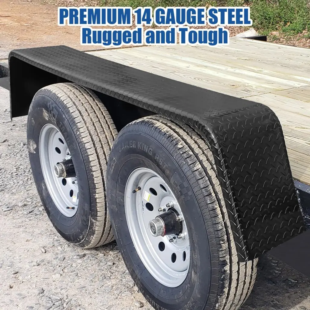 Trailer Fenders for Tandem Axle Trailers - Heavy Duty Plate Steel Fenders for 13"-15" Wheels (Set of 2)Key Features:1. Heavy-Duty 14-Gauge Steel ConstructionCrafted from robust 14-gauge plate steel, these fenders provide exceptional strength and durability to withstand harsh weather conditions, road debris, and demanding towing environments.2. Perfect Fit for 13"-15" WheelsSpecifically designed to accommodate tires ranging from 13 to 15 inches in diameter, making them an ideal choice for tandem axle trailers requiring reliable wheel protection.3. Generous Protective CoverageFeatures dimensions of 72-7/8" in length, 10-1/4" in width, and 13" in height, providing comprehensive coverage and robust shielding for your trailer tires against rocks, debris, and road hazards.4. Enhanced Trailer ProtectionEffectively protects both your trailer and tires from damage caused by flying rocks, road debris, and other hazards encountered during transportation, helping maintain your trailer's condition and value.5. Durable Finish & Easy InstallationFinished with a durable coating to resist corrosion and wear. Note: Backing plates not included. Professional installation recommended for optimal safety and performance.Specifications:? Material: 14-Gauge Steel? Finish: Black Powder Coated? Wheel Compatibility: 13" - 15" Tires? Dimensions: 72-7/8" L x 10-1/4" W x 13" H? Set Includes: 2 Fenders? Item Weight: 72.27 lbs (total)? Recommended Use: Tandem Axle Trailers