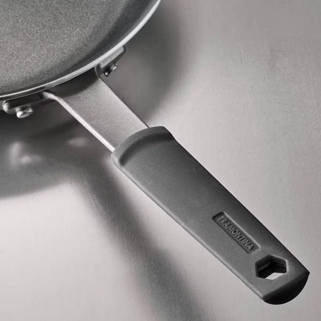 Fry, scramble, brown, saute, and sear like an experienced chef Tramontina`s PRO Fusion 10 in Fry Pan features a new Fusion Rivet System which provides a rivet-less, smooth interior cooking surface. This clever and exclusive system provides easy cooking and effortless cleanup, while maintaining all the strength and durability of a traditional riveted handle assembly, and the cast stainless steel handle features a removable, silicone, soft-grip for maneuverability. The rivet-less cooking surface, combined with the advanced nonstick coating, provides high performance and excellent food release. The fry pan's commercial-grade, heavy-gauge aluminum construction distributes heat quickly and evenly. These pans are designed and manufactured to withstand the rigors of a professional kitchen, and easily adapt to home and non-commercial use for everyday use. This cookware is NSF certified, compatible with gas, electric and ceramic glass cooktops, can be used in the oven up to 400°F / 204°C.