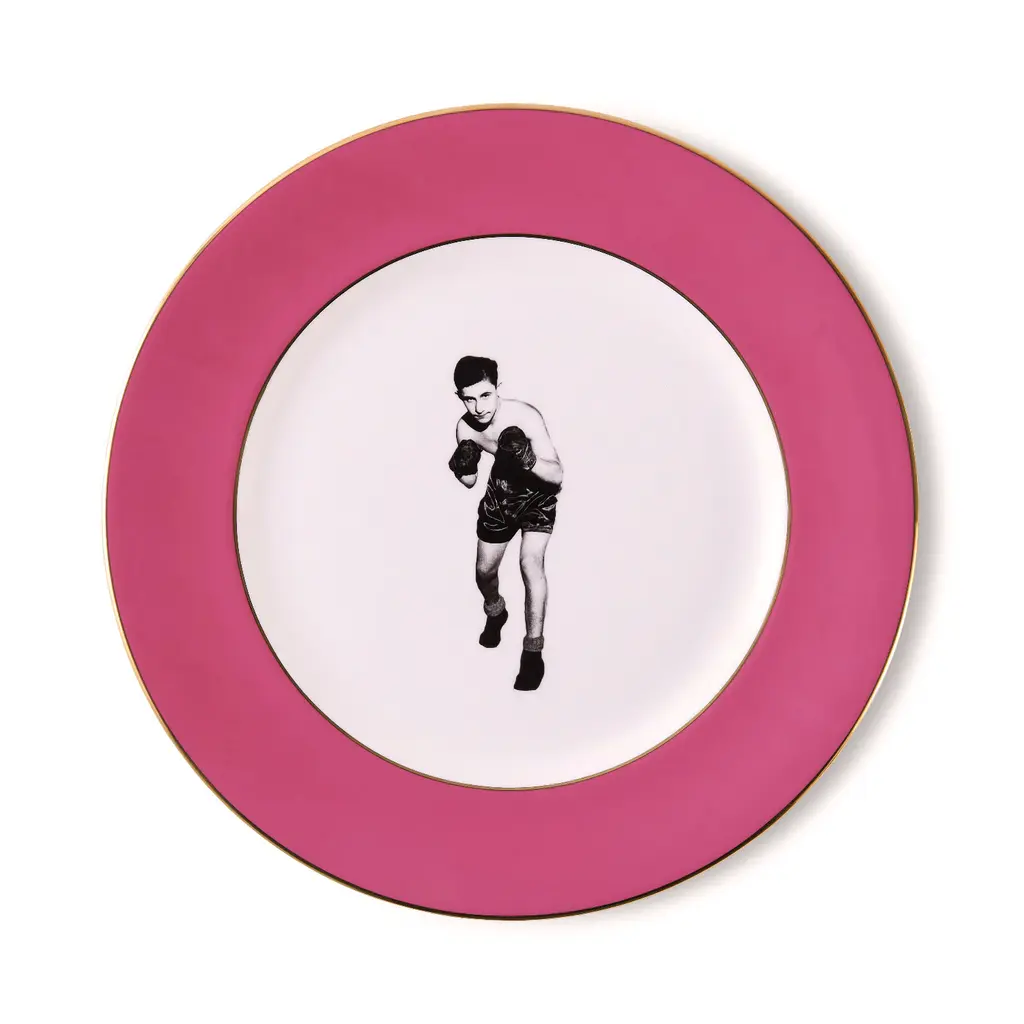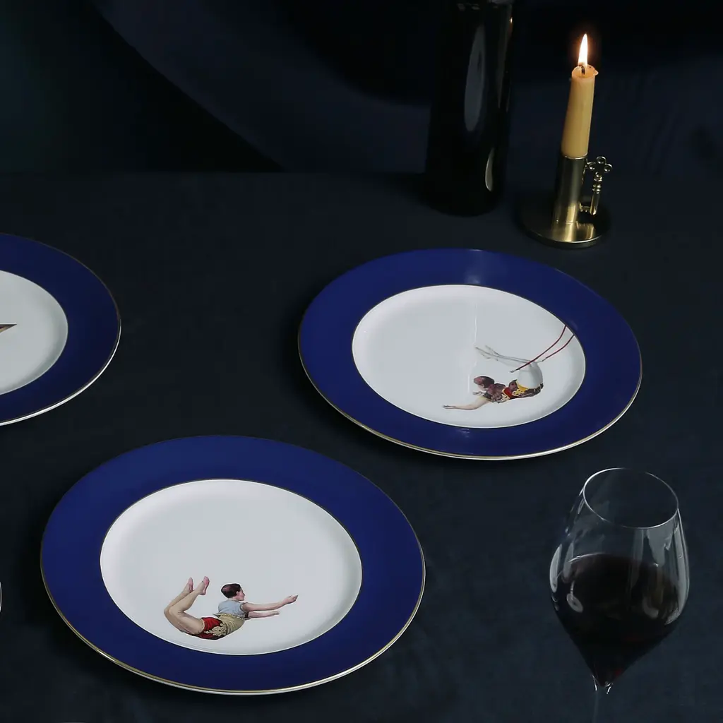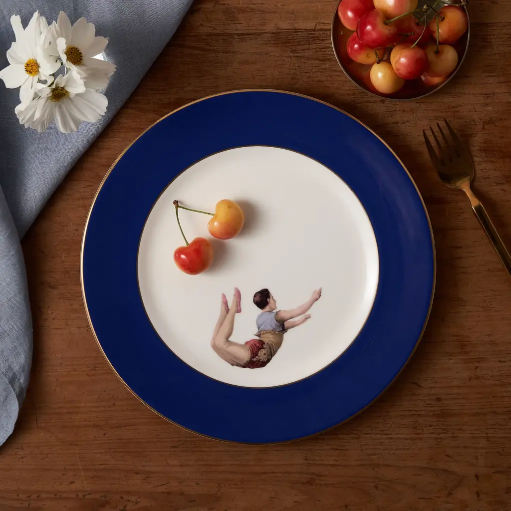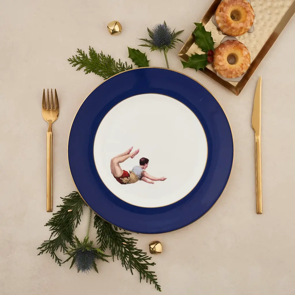 An exquisitely handcrafted fine bone china Cobalt Blue dinner plate with the Trapeze Boy design from Melody Rose's Acts of Daring collection.Each plate is finished with a hand painted 22kt burnished gold edge, both luxurious and dishwasher friendly.Perfect on its own or mix, match and layer with any of the designs from the Melody Rose collection to create a heritage tableware set with a 21st century twist.The playful design paired with the best of British craftsmanship makes a wonderful gift for foodies, design lovers and everyone in between.