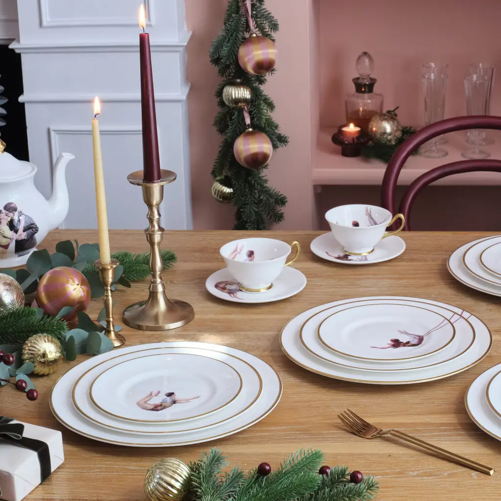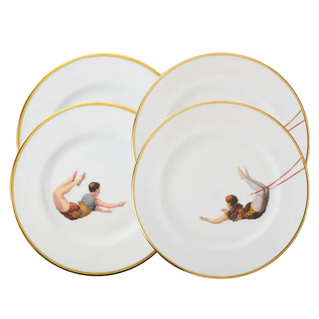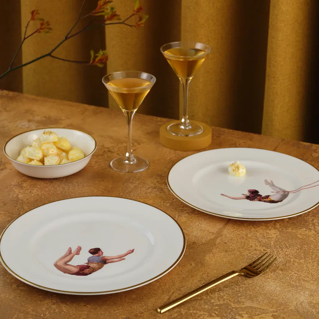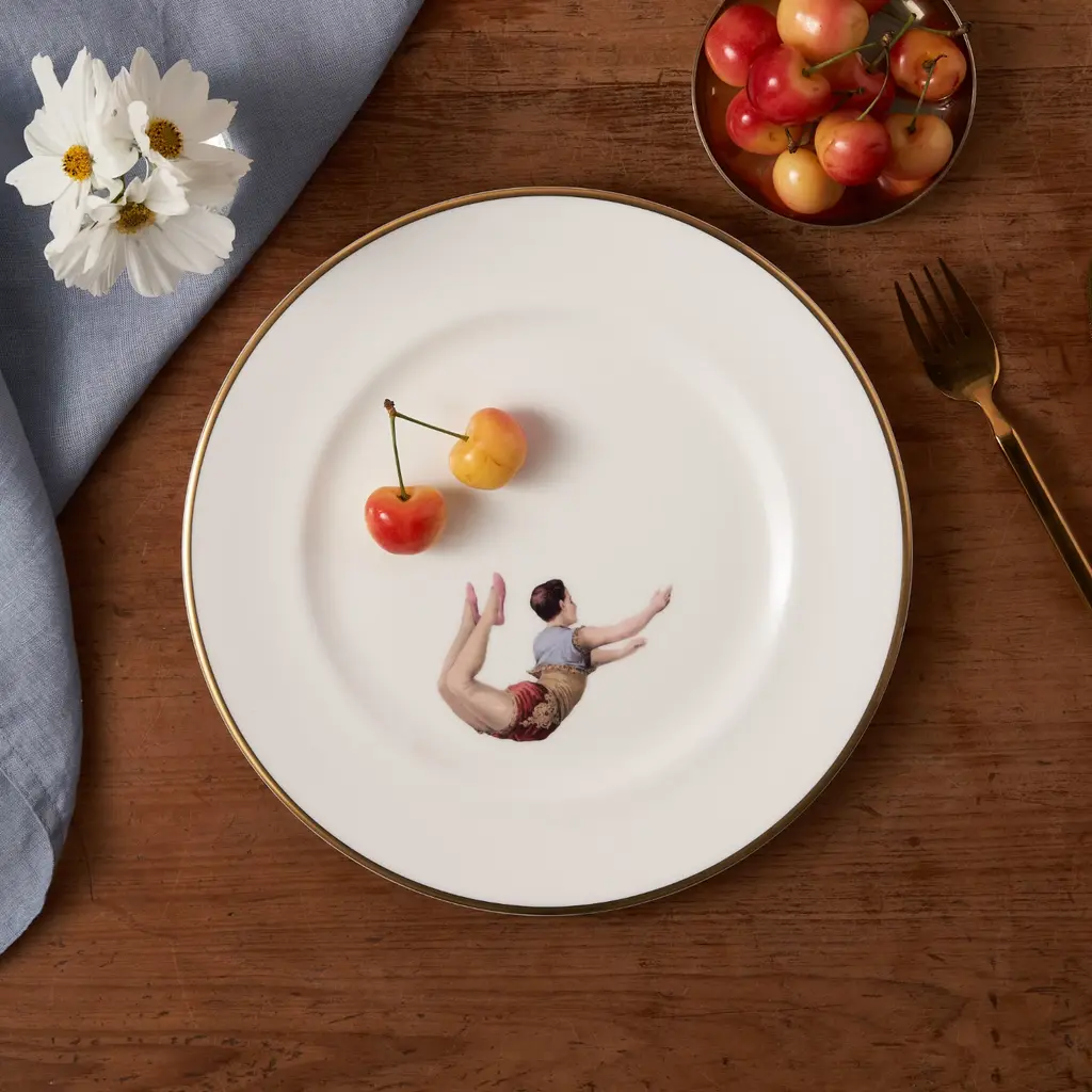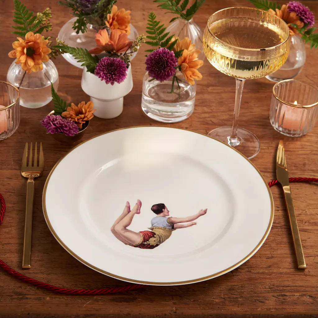 An exquisitely handcrafted fine bone china dinner plate featuring the circus inspired Trapeze Boy design.Flying through the air with the greatest of ease, the daring acrobatic design celebrates the old world glamour and excitement of life under the big top.A perfect plate to use on it's own, matched with the Trapeze Girl or mix and layer with pieces from any of the Melody Rose collection to create a heritage tableware set with a 21st century twist.Durable enough for every day use, the 22kt burnished gold gilding and glorious detail also make them perfect for the grandest occasions.