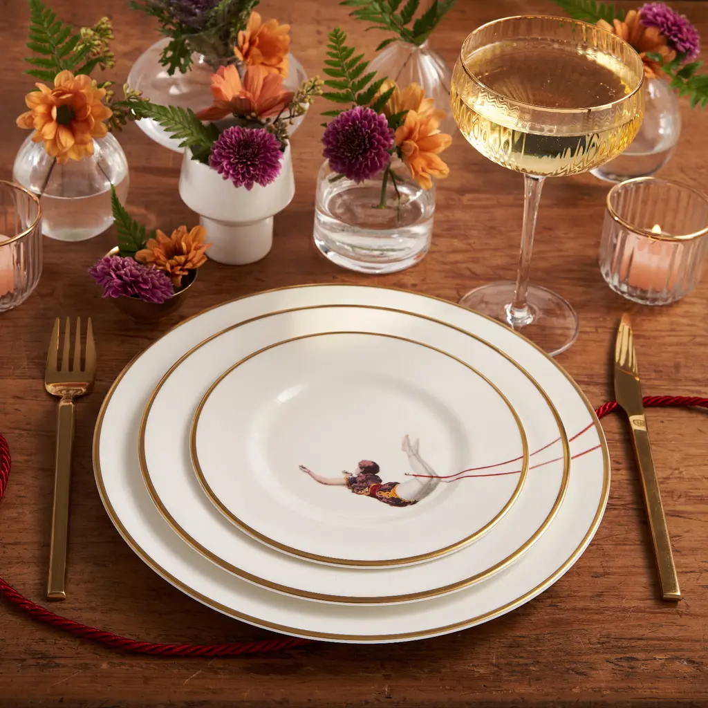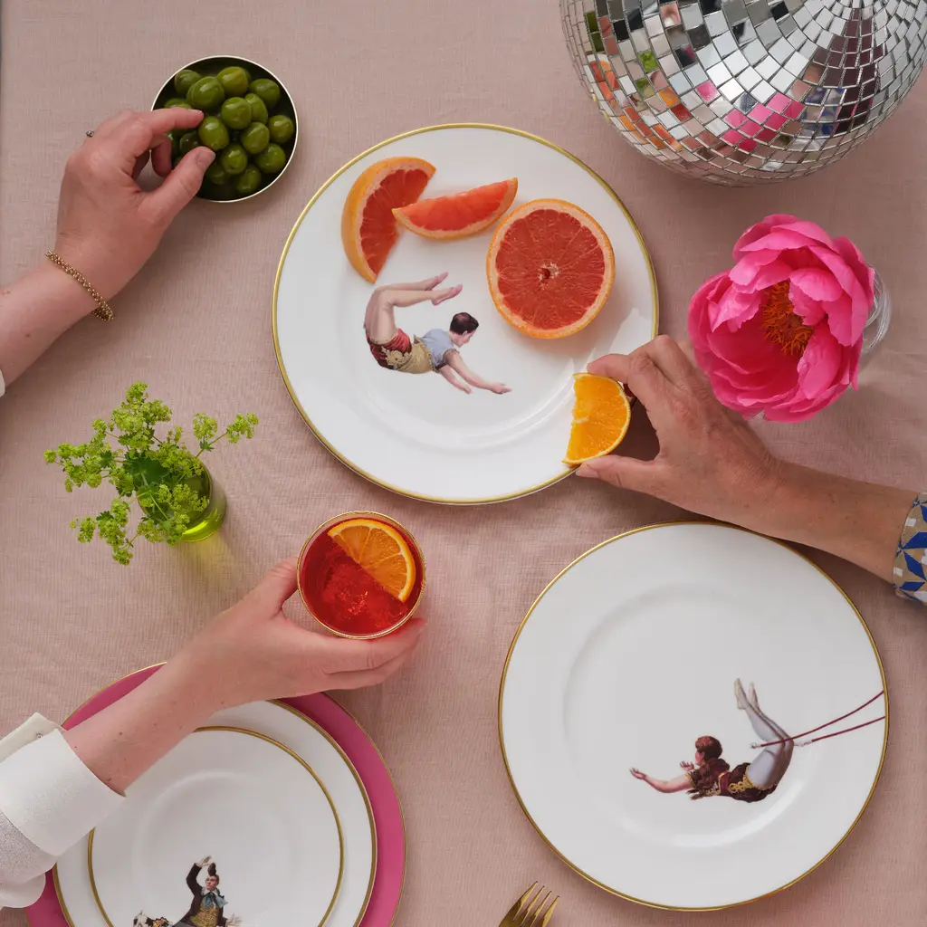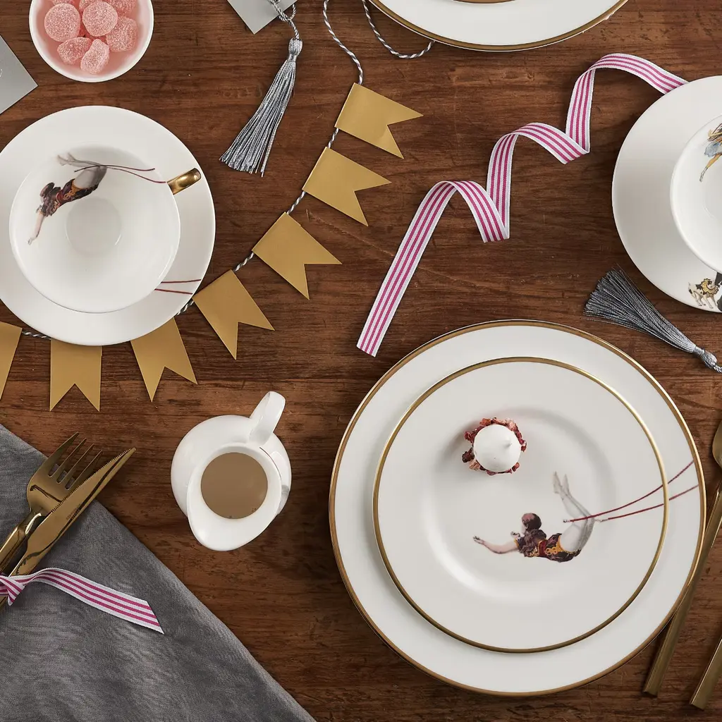 An exquisitely handcrafted fine bone china salad/lunch plate featuring the Trapeze Girl from the Melody Rose Acts of Daring Collection.Flying through the air with the greatest of ease the joyful circus inspired design celebrates the old world glamour and excitement of life under the big top.A perfect plate to use on it's own or mix, match and layer with pieces from the Melody Rose Collections to create your own set of heritage tableware with a 21st century twist.Durable enough for every day use, the 22kt burnished gold gilding and glorious detail also make them perfect for the grandest occasions.