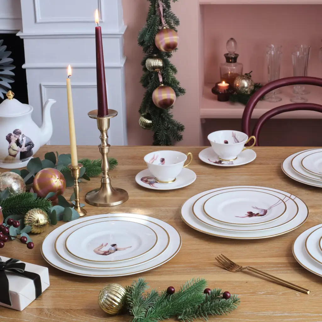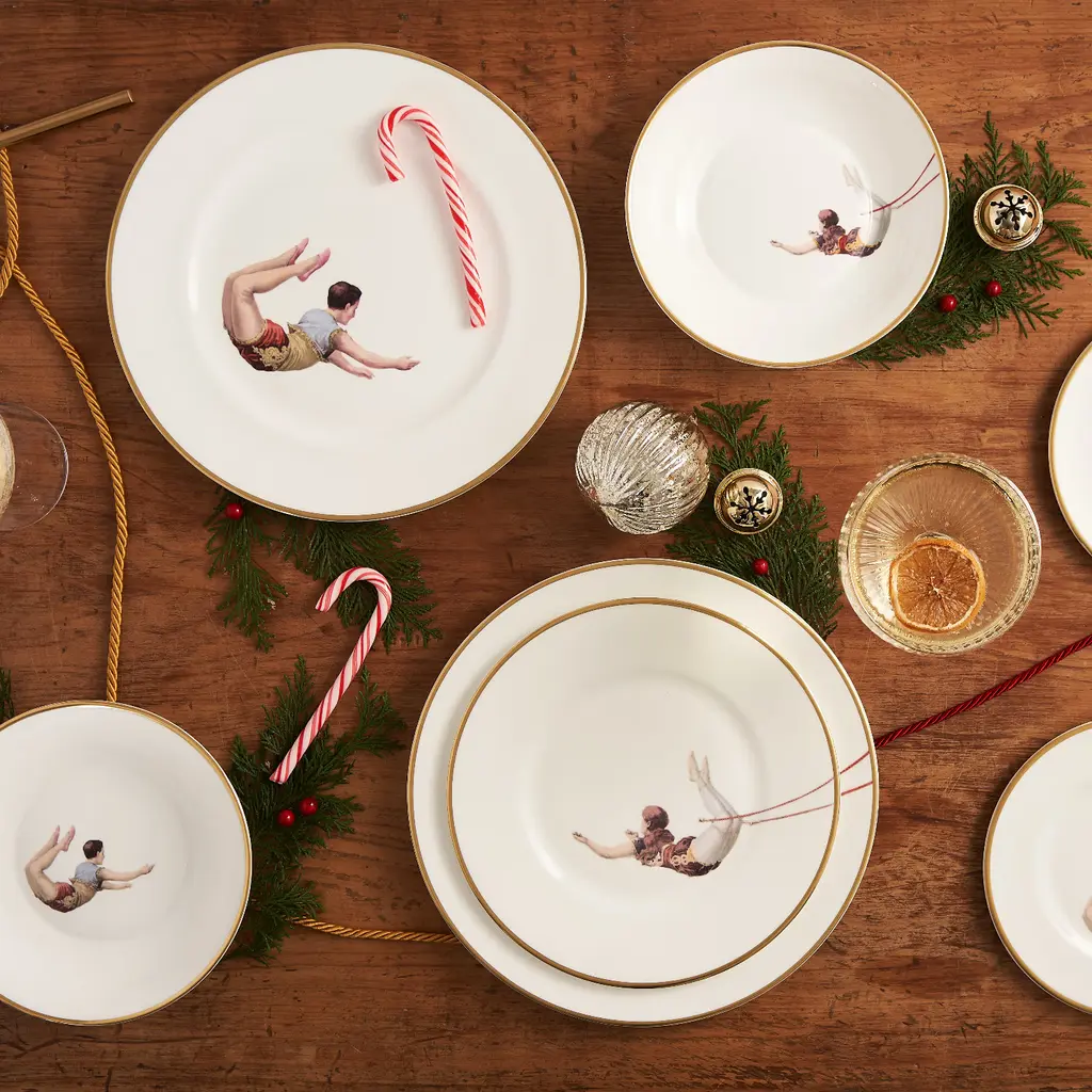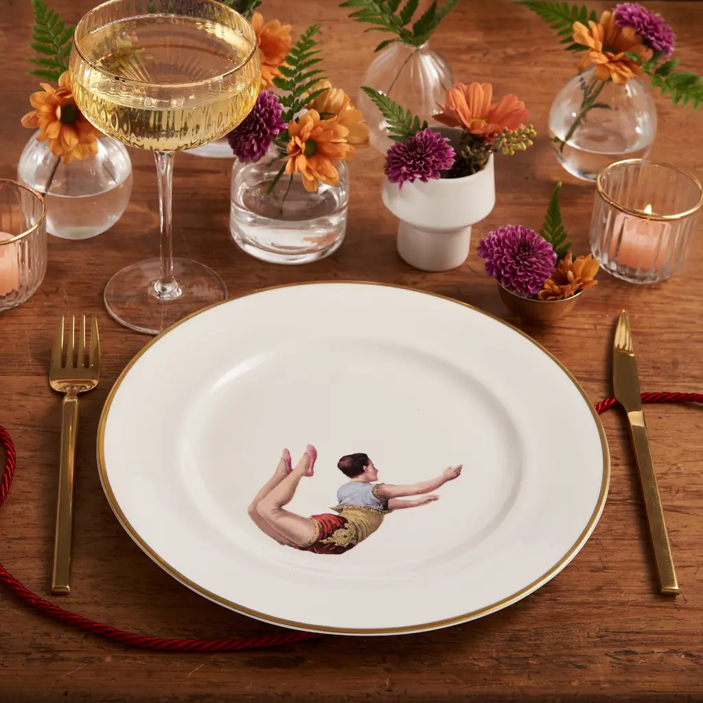 An exquisitely handcrafted set of four bone china dinner plates from the Melody Rose Acts of Daring Collection. The circus-inspired set includes 2 x Trapeze Girl and 2 x Trapeze Boy dinner plates, everything you need for an elegant dinner party for four. Each plate features hand painted 22kt burnished gold trim for a luxurious and dishwasher friendly finish.Beautiful on their own or mix, match and layer with bowls and smaller plates from the Melody Rose fine bone china range to create your own heritage tableware set with a 21st century twist. Trapeze designs are available on plates in three sizes, cereal/soup bowls and pasta bowls. Durable enough for everyday use, the 22kt gilding and glorious detail also make them perfect for the grandest occasions.