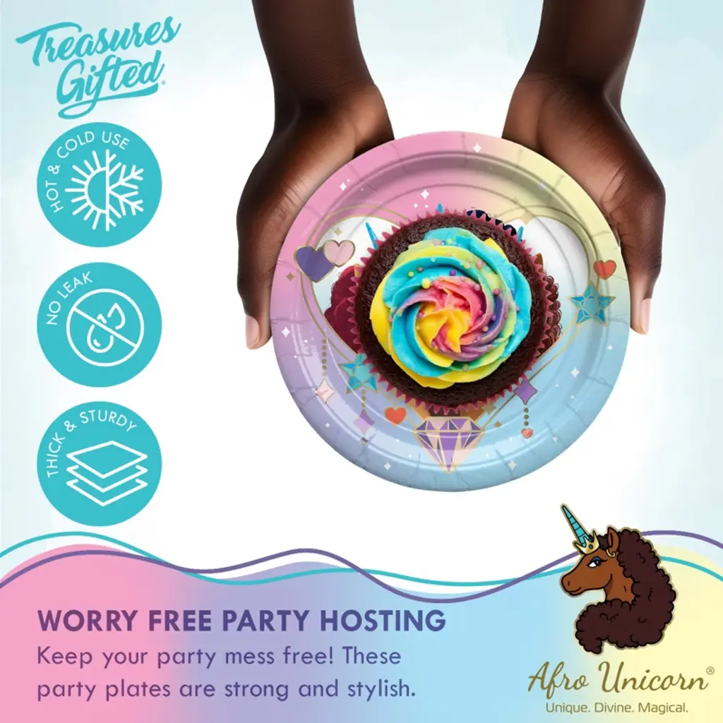 Treasures Gifted Afro Unicorn Dessert Plates 7In - Disposable Paper Plates - Afro Unicorn Birthday Party Supplies