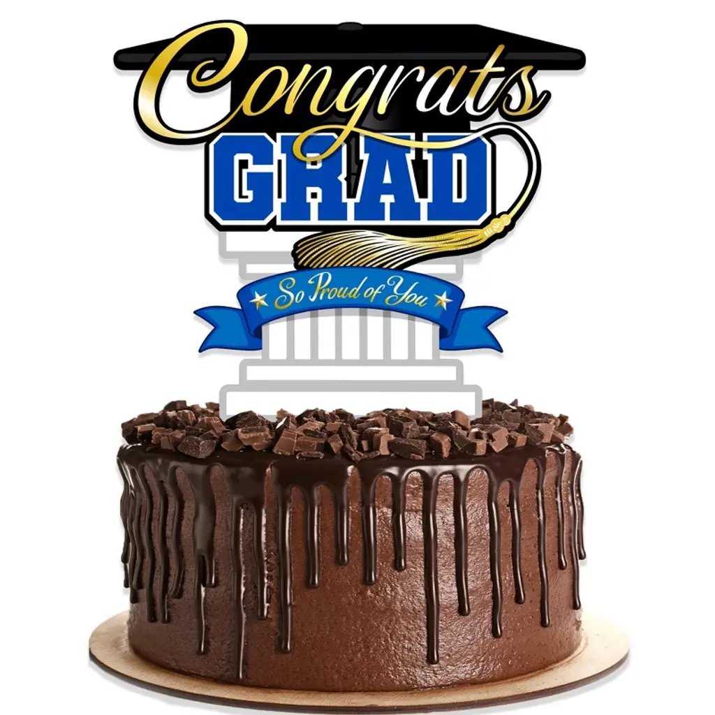 Make your graduation party unforgettable with our vibrant and easy-to-use black and gold graduation decorations! Our high-quality gold graduation party decorations are sure to add excitement and sophistication to your celebration. Made with high-quality materials, it's durable and long-lasting, ensuring that it stands up all throughout your party. Check out our store for more gold graduation party supplies, including banners, backdrops, balloons, and more! This gold congrats grad cake topper kit includes: (1) 9in tall cake topper (2) food safe paper dowels for adjustable for your cake height (6) clear tape strips for securing the dowels to the cake topper (24) 4in tall double sided cupcake toppers (24) 2.3in tall cupcake wrappers