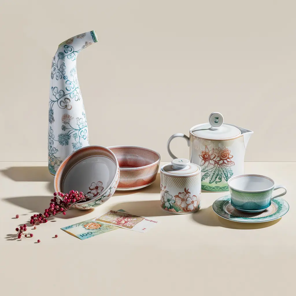The new complete table service created for Vista Alegre by Brazilian designer Brunno Jahara, author of Transatlântica, brings sophistication and modernity along with a dash of surprise. Inspired by a selection of banknotes and stamps from all over the world, the author chose motifs, colors and graphics that, by harmonizing with the porcelain, amplify its richness. Combined dynamically, the natural or geometric motifs and the various shades of blue, green and natural nudes avoid any repetition. Treasures skillfully blends classical delicacy, evident in the floral motifs, and a distinct avant-garde profile, revealed by the twist of contemporary graphics. A collection that is a real treasure trove.