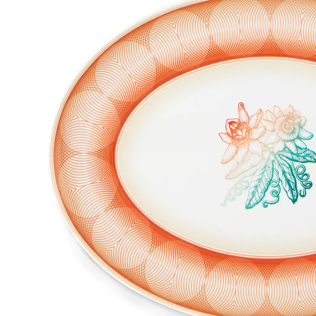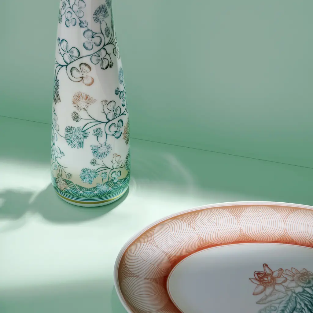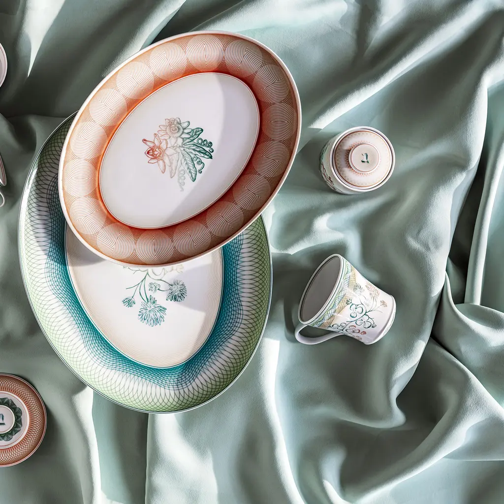 The new complete table service created for Vista Alegre by Brazilian designer Brunno Jahara, author of Transatlântica, brings sophistication and modernity along with a dash of surprise. Inspired by a selection of banknotes and stamps from all over the world, the author chose motifs, colors and graphics that, by harmonizing with the porcelain, amplify its richness. Combined dynamically, the natural or geometric motifs and the various shades of blue, green and natural nudes avoid any repetition. Treasures skillfully blends classical delicacy, evident in the floral motifs, and a distinct avant-garde profile, revealed by the twist of contemporary graphics. A collection that is a real treasure trove.