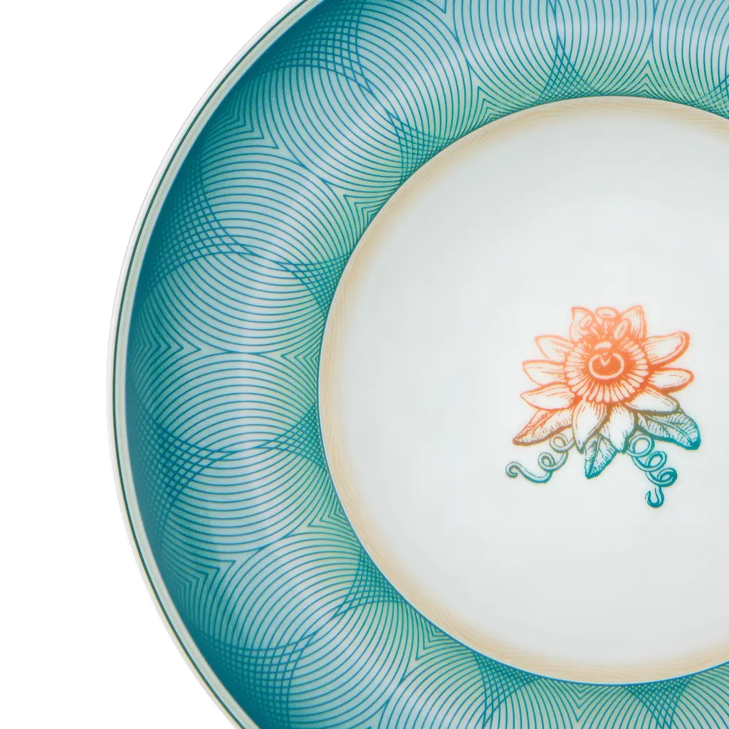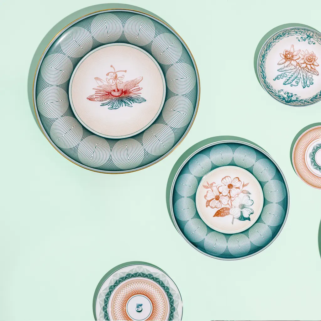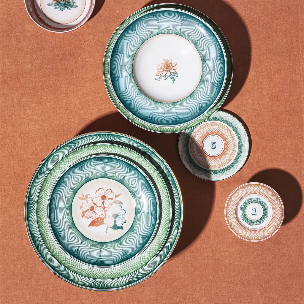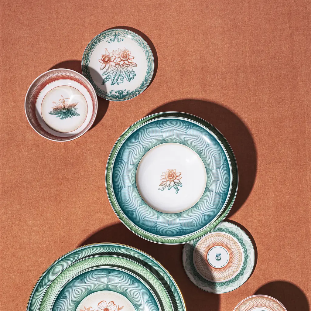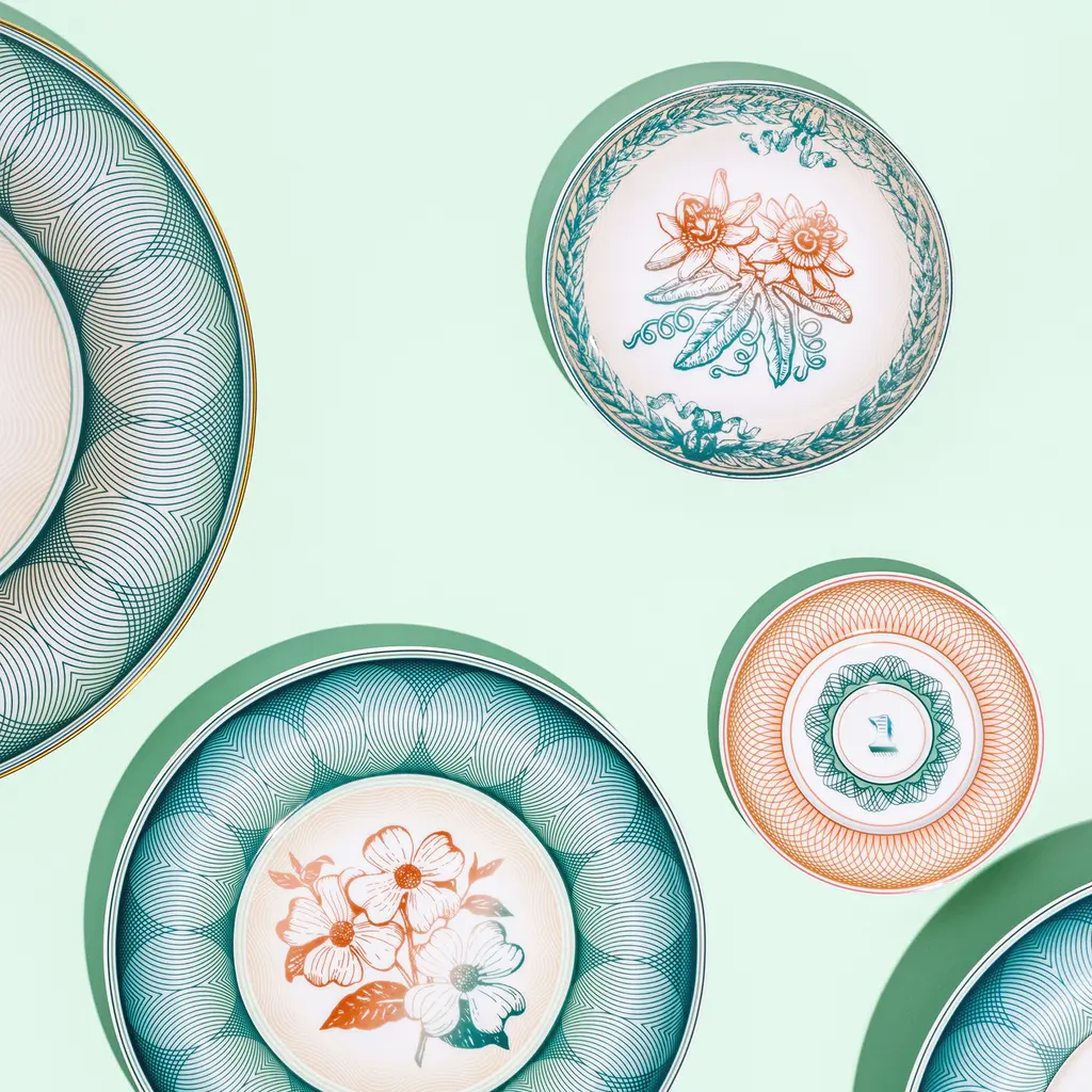 The new complete table service created for Vista Alegre by Brazilian designer Brunno Jahara, author of Transatlântica, brings sophistication and modernity along with a dash of surprise. Inspired by a selection of banknotes and stamps from all over the world, the author chose motifs, colors and graphics that, by harmonizing with the porcelain, amplify its richness. Combined dynamically, the natural or geometric motifs and the various shades of blue, green and natural nudes avoid any repetition. Treasures skillfully blends classical delicacy, evident in the floral motifs, and a distinct avant-garde profile, revealed by the twist of contemporary graphics. A collection that is a real treasure trove.
