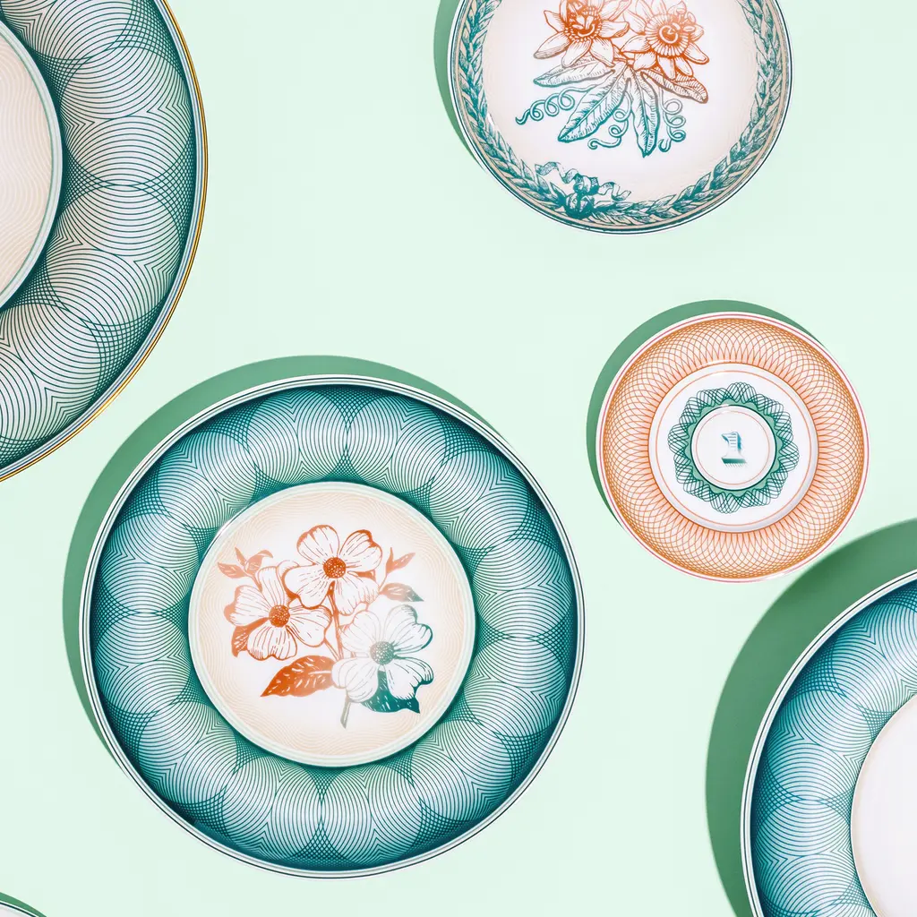 The new complete table service created for Vista Alegre by Brazilian designer Brunno Jahara, author of Transatlântica, brings sophistication and modernity along with a dash of surprise. Inspired by a selection of banknotes and stamps from all over the world, the author chose motifs, colors and graphics that, by harmonizing with the porcelain, amplify its richness. Combined dynamically, the natural or geometric motifs and the various shades of blue, green and natural nudes avoid any repetition. Treasures skillfully blends classical delicacy, evident in the floral motifs, and a distinct avant-garde profile, revealed by the twist of contemporary graphics. A collection that is a real treasure trove.