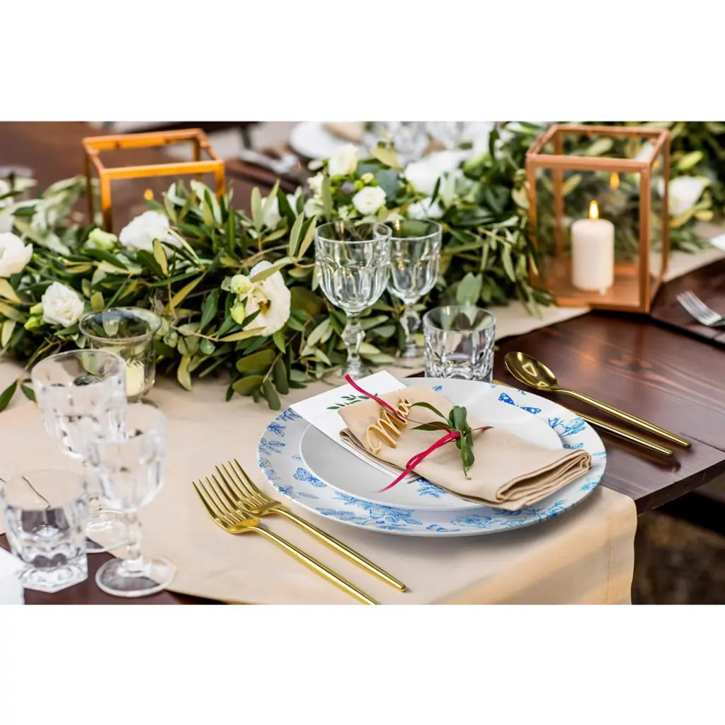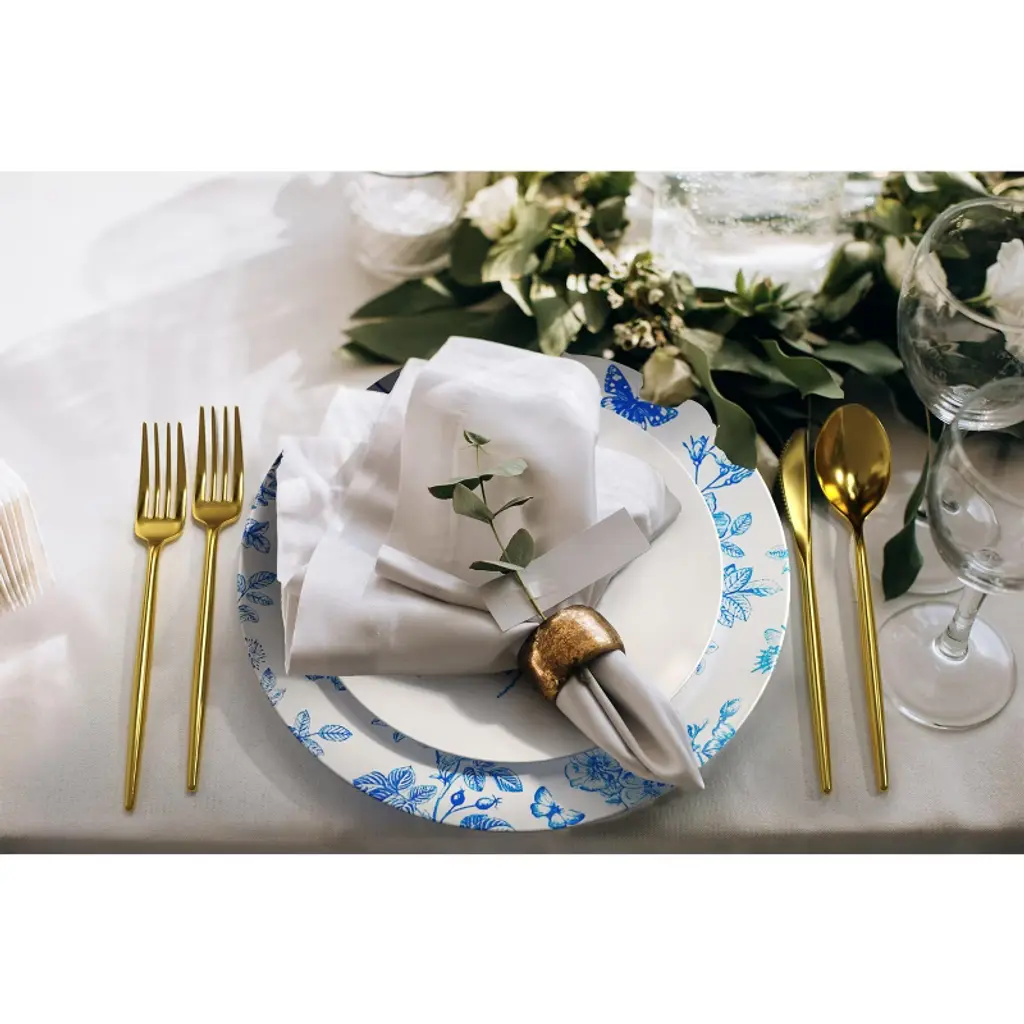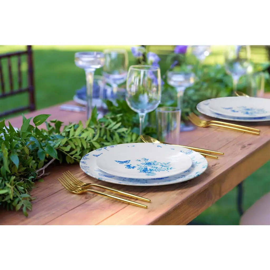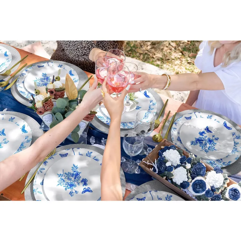 Introducing the "Trendables White & Blue Floral Design Disposable Plastic Plate Set" - an enchanting addition to your gatherings, designed to infuse elegance and convenience into every dining experience. This exquisite set caters to 40 people with a total of 80 plates, ensuring everyone enjoys a delightful meal in style. The Disposable plastic plates boast a pristine white base adorned with a captivating blue floral and butterfly design, creating a picturesque setting that evokes a sense of tranquility and charm. Whether it's a summer garden party, a bridal shower, or a family reunion, these plates effortlessly elevate the ambiance, adding a touch of sophistication to any occasion. Crafted from premium-quality plastic material, these plastic plates disposable are not only visually stunning but also exceptionally sturdy. You can confidently serve a diverse array of dishes, from delectable appetizers to mouthwatering main courses and delightful desserts, without any concern about the plates losing their shape. With 40 10-inch plates and 40 8-inch plates, this set is thoughtfully curated to cater to various dining needs. The larger plates are ideal for serving generous portions of main courses, while the smaller ones are perfect for delectable starters or sweet treats. Each plate's well-proportioned design ensures an enjoyable dining experience for all your guests. One of the key highlights of this disposable plastic plate set is its practicality. After the celebrations, you can bid farewell to tedious dishwashing sessions, as these plates are conveniently disposable. This time-saving feature allows you to focus on cherishing the company of your loved ones and relishing the precious moments spent together. Whether you're planning an intimate get-together or a grand event, the Trendables White & Blue Floral Design Disposable Plastic Plate Set promises to be the epitome of convenience and beauty. Embrace the harmonious blend of elegance and functionality, and let this captivating plate set become the centerpiece of your next memorable gathering. Make a lasting impression on your guests with the charm and allure of these floral-inspired plates, as you create unforgettable memories that will be cherished for years to come.