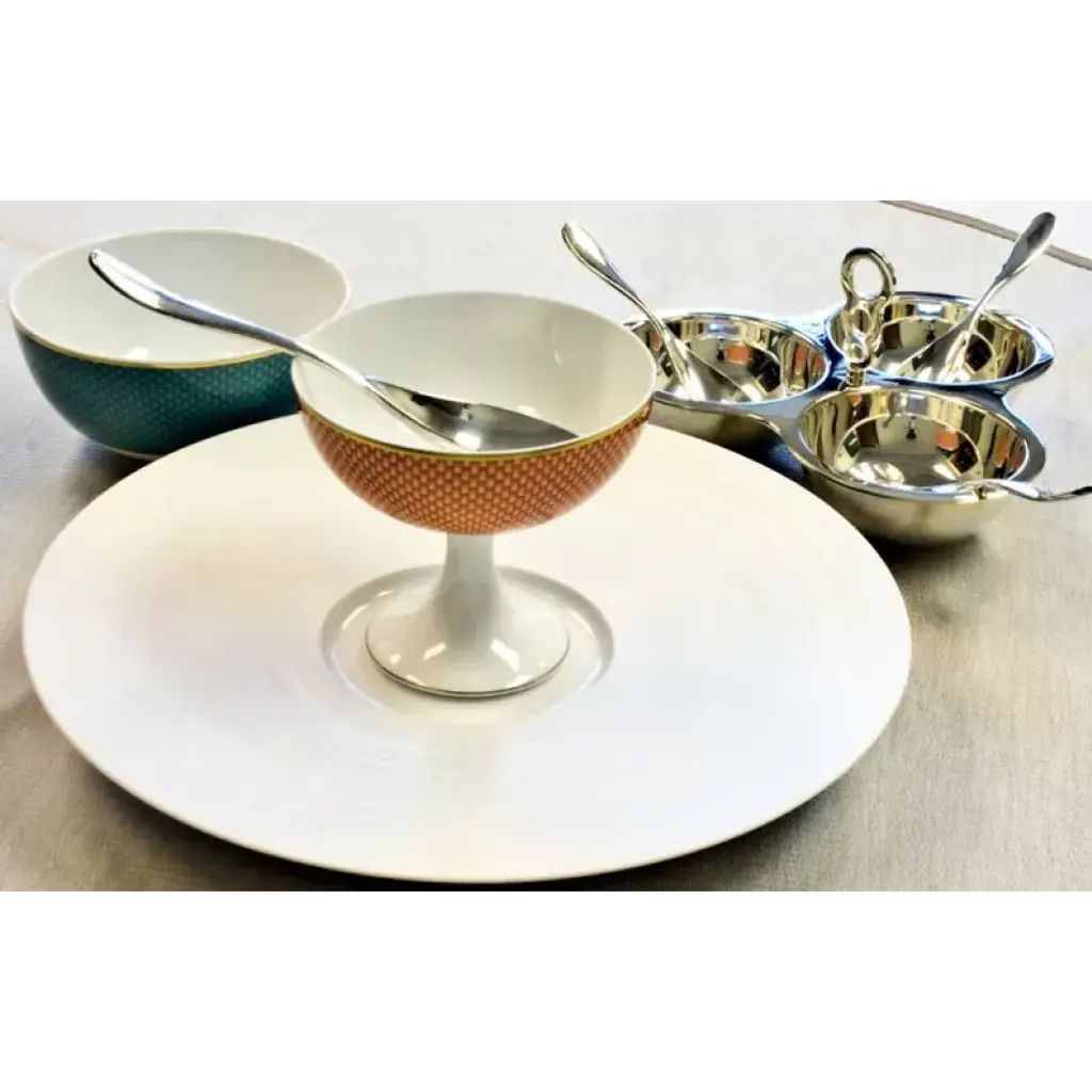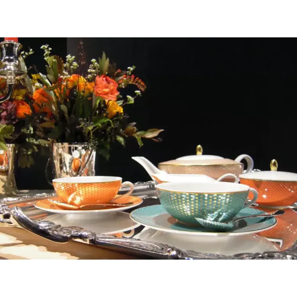 From the house of Raynaud, the Tresor dinnerware collection features an ornate pattern of gold and a range of colors from earth tones to turquoise. Mix and match the colors for a truly unique look. Raynaud was established in 1849 and is the only survivor of 11 porcelain factories existing in Limoges, France. After years of research, Raynaud discovered techniques to create infinite combinations of fade-resistant decorations that is still used by porcelain makers. Boasting a client list of numerous presidents to Princess Diana, Raynaud has been the synonym of quality, known and recognized on every continent.