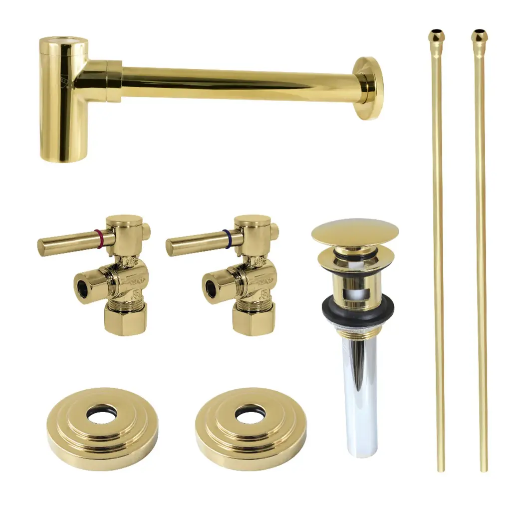 This 8-piece vessel sink plumbing supply kit from Kingston Brass provides all the necessary parts in the water flow process of your vessel sink. The set includes two 1/4 turn hardisc angle stops with lever handles, two 30" bullnose supply line, two contemporary decorative flanges, a contemporary 1-1/4" OD decorative bottle-trap and a 22 gauge 1-1/4" vessel sink drain without overflow. Constructed of high quality brass and a tarnish-resistant finish, designed for long-lasting performance. Available in a variety of stunning finishes ready to match any home decor.FeaturesTwo 5/8" O.D. comp x 3/8" O.D. comp quarter turn angle stop valvesTwo high profile flangesTwo pieces 3/8" x 30" bull nose rigid supply linesOne modern 1-1/4" O.D. bottle style p-trapOne drain without overflow for vessel sinkAngle stops include modern lever handle
