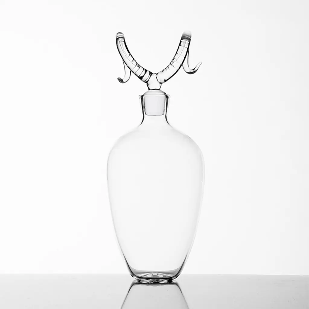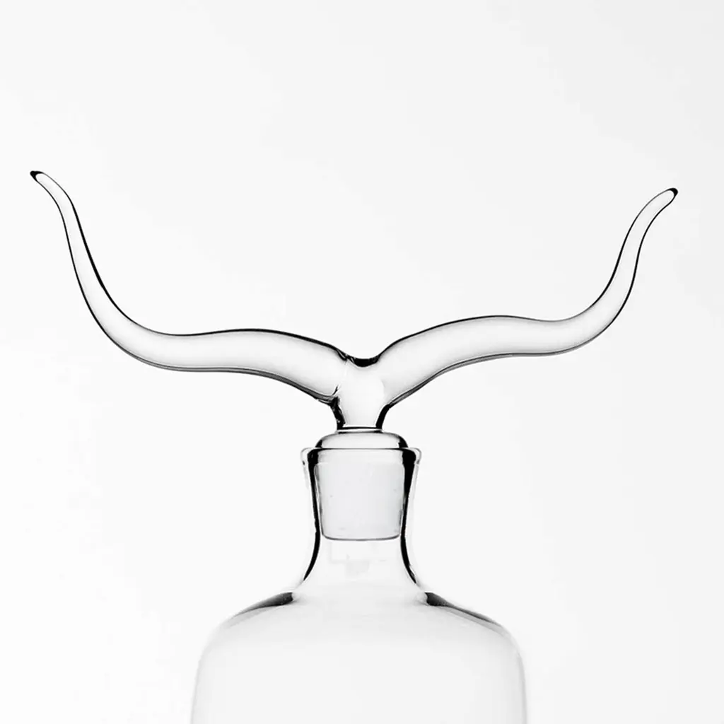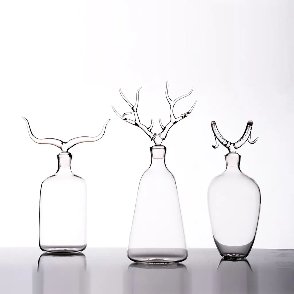 'Trophy Bottles Set' Hand-blown Glass bottles.The Trophy Bottles Set by Simone Crestani. Set includes 1 Deer Bottle, 1 Longhorn Bottle, and 1 Bighorn Bottle. 3 pieces in total."A collection of bottles with linear shapes that reserve a surprise at the top. Elk, antelope, deer or buffalo? Each trophy represents in detail the horns of a wild animal and dedicates a poetic hymn to the inhabitants of the most pristine nature."Dimensions: 18x12x34 - 19x11x28 - 12x12x29Volume for Bottles: Can easily contain 1 bottle of wine.Materials: Borosilicate GlassNote Since everything is handmade the product that you will receive may be slightly different than the photos.